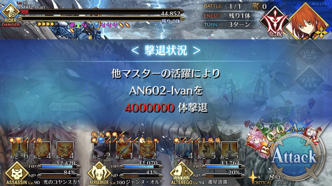 マシュも攻防共に結構頼れるしね。(殿に居てマジで助かりました。)(討伐戦だからと言って舐めてはいけない・・・。)今仕事終わってレイドやるぞ!と思ったら終わってるんですけど!?