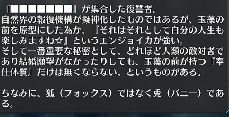 妲己の器に入った声達の自我(コヤンスカヤ)的な?なんつーか、勝率7割だの必殺の切り札たる対獣宝具だのと急速に失敗フラグ乱立しはじめたな……