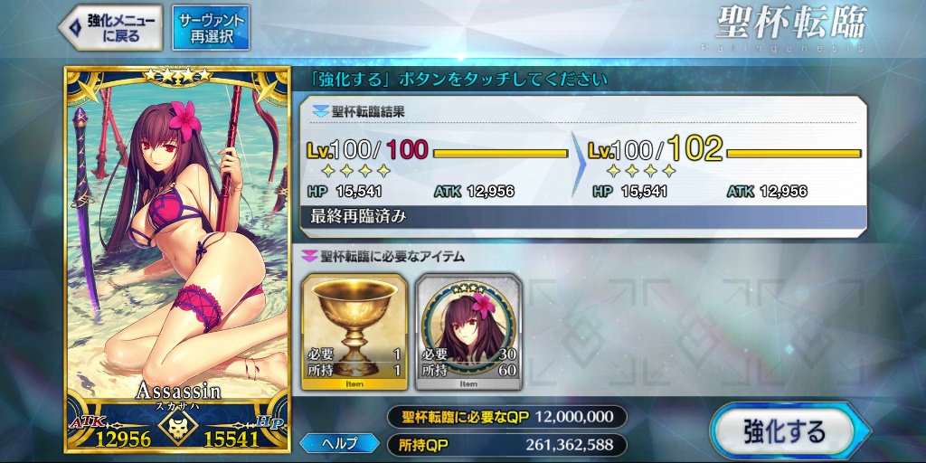 推しレベル120が二人もいるだなんて羨ましい!水着スカサハはコインが足りない……。綱さんをレベル120にするほうが速いかもしれない。>>952