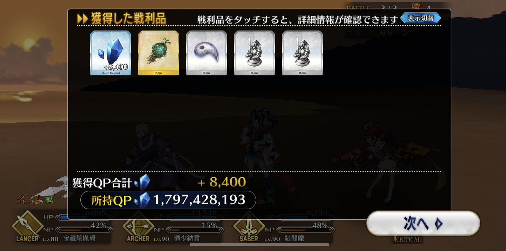 自分は計算したら、手持ちのQPで全員スキルマ(9/9/9まで)到達できると判明したのでQP集めるのはやめた