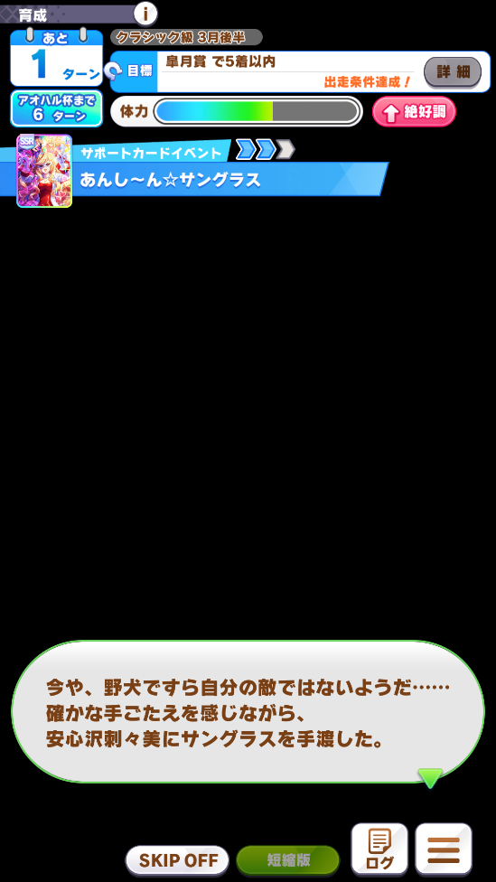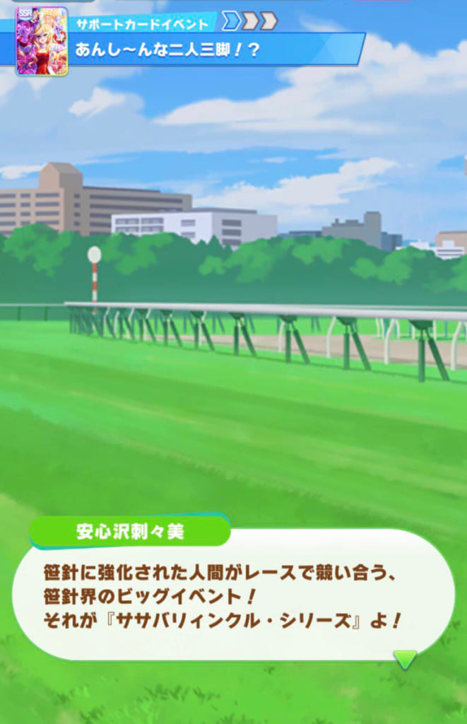 万が一実装されたらランダムイベントで葦毛と会話できたから調子があがるとかありそうだなオメー>>913