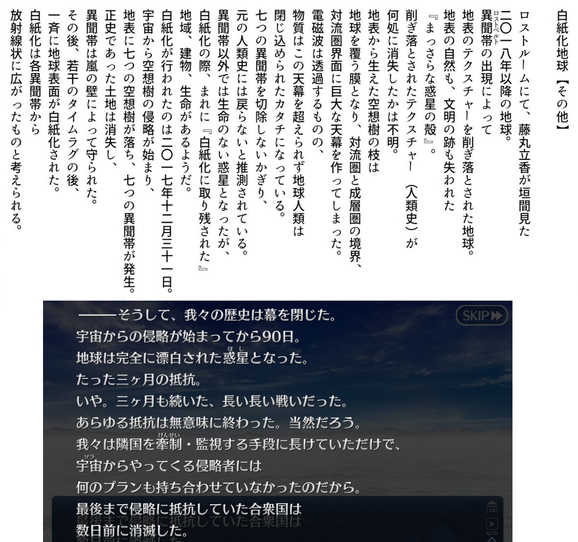 カルデアのある地球にも謎の建物の残骸とかはあったけど、ブルーブックのいる地球と同じ地球なのかは分からないし、下手したらパラレルワールドや編纂事象の地球とリンクした地球とかなのかもしれない>>58