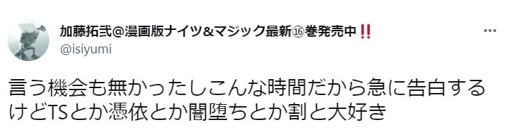 その週に読んだジャンプ・サンデー・マガジンなどの漫画、その時放送しているアニメ・懐かしのゲームの思い出など、とにかく何でもアリ! 二次創作画像は転載可能な物に限り、その際必ず引用元を併記してください。Web漫画なら配信後、TVアニメは放送終了後、雑誌・漫画単行本・ファンブックなら発売日正午ラノベ新刊は刊行1週間後、映画とゲームは2週間後にネタバレが解禁されます!対立・煽りなどの迷惑行為、番組の実況(アニメ・ゲーム問わず)をNGにして、皆好きなように語りましょう!!!