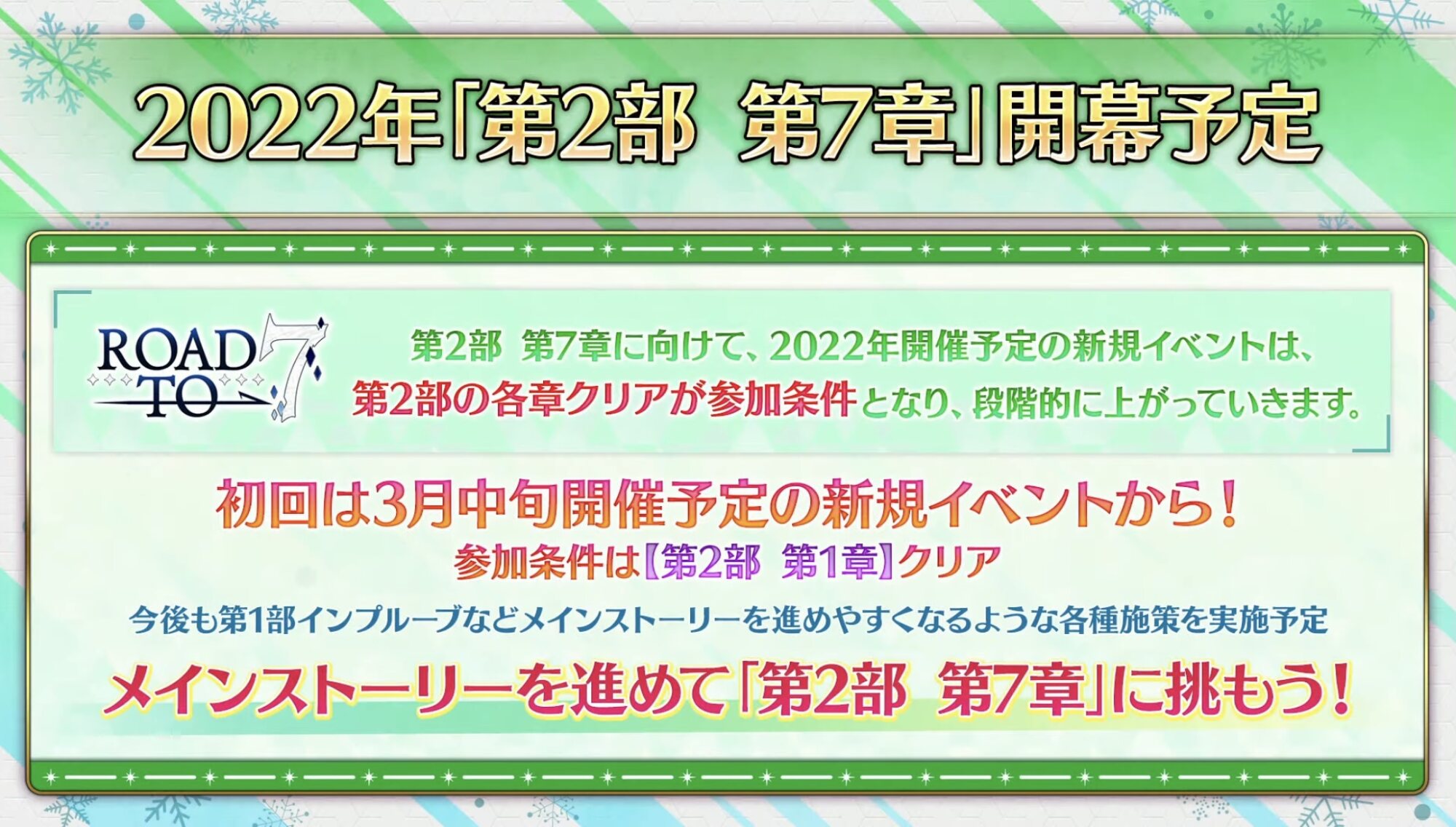 2部各章クリアが参加条件のイベントが多くて、参加条件が段階的に上がっていくよまでなので、新規イベントが7つかはわからんね