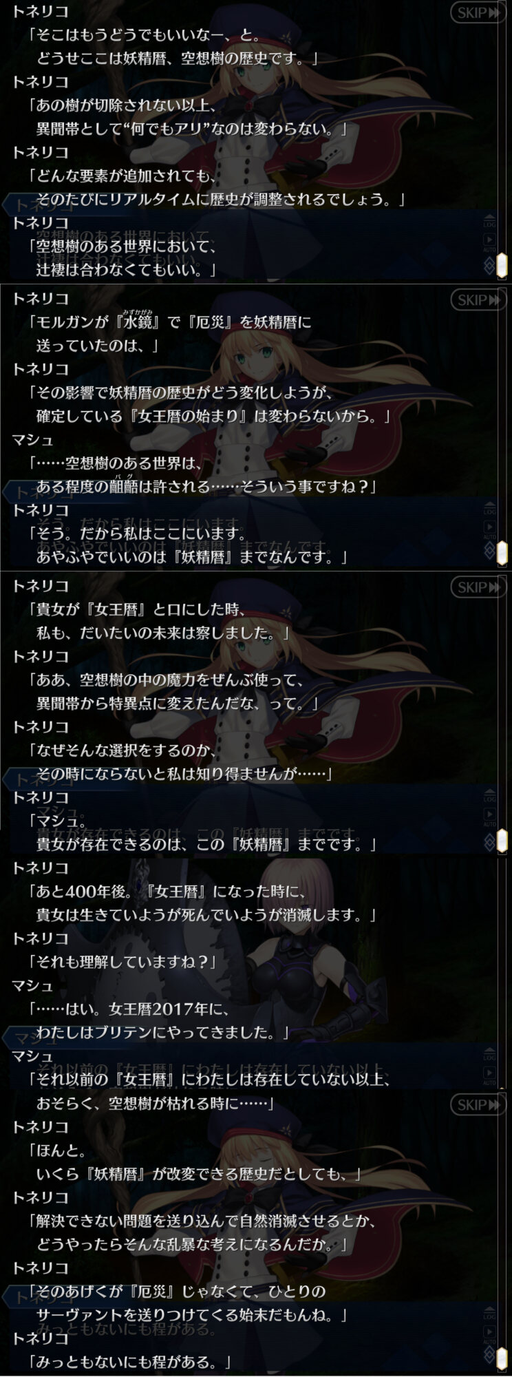 このトネリコはマシュがもたらした情報(「女王暦」の単語とか女王暦元年を基準にした妖精暦の年号とか)で色々察してるからってのも思う、そこに自身が有する空想樹の特性とか未来から送り込まれこの時代に追加因子として書き加えられたマシュの存在から今自分が居るこの歴史に未来が存在しない事も……>>81