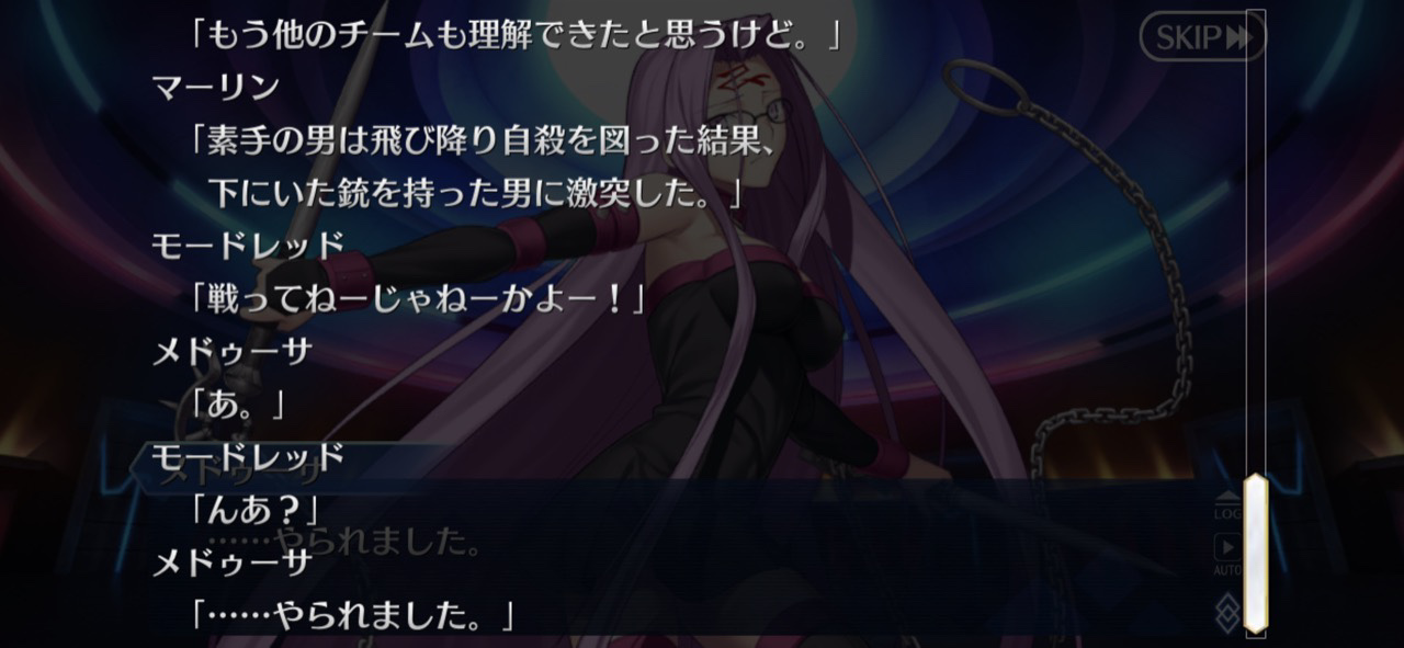 パラケルススの独白もあってだんだんとAチームも応援し始めてたけど、タッチされたあとのオルタニキが本当に悔しそうでこっちも悔しくなってしまった。今までにない三点リーダの数に最後の一手に対しての感情が滲み出てる……。でもルール違反疑惑があったとしても「負けは負け」とすっぱり受け入れてるのがクー・フーリンらしくていい。