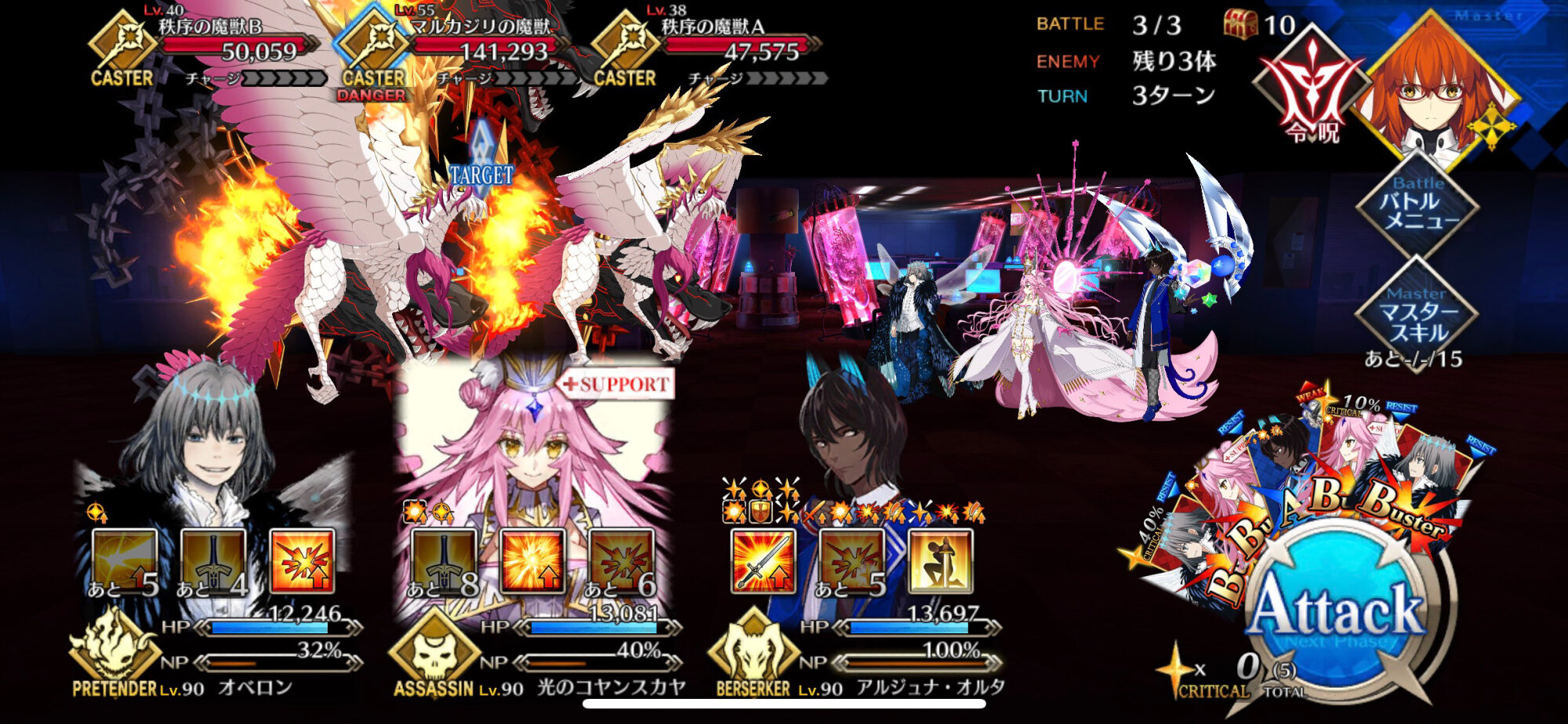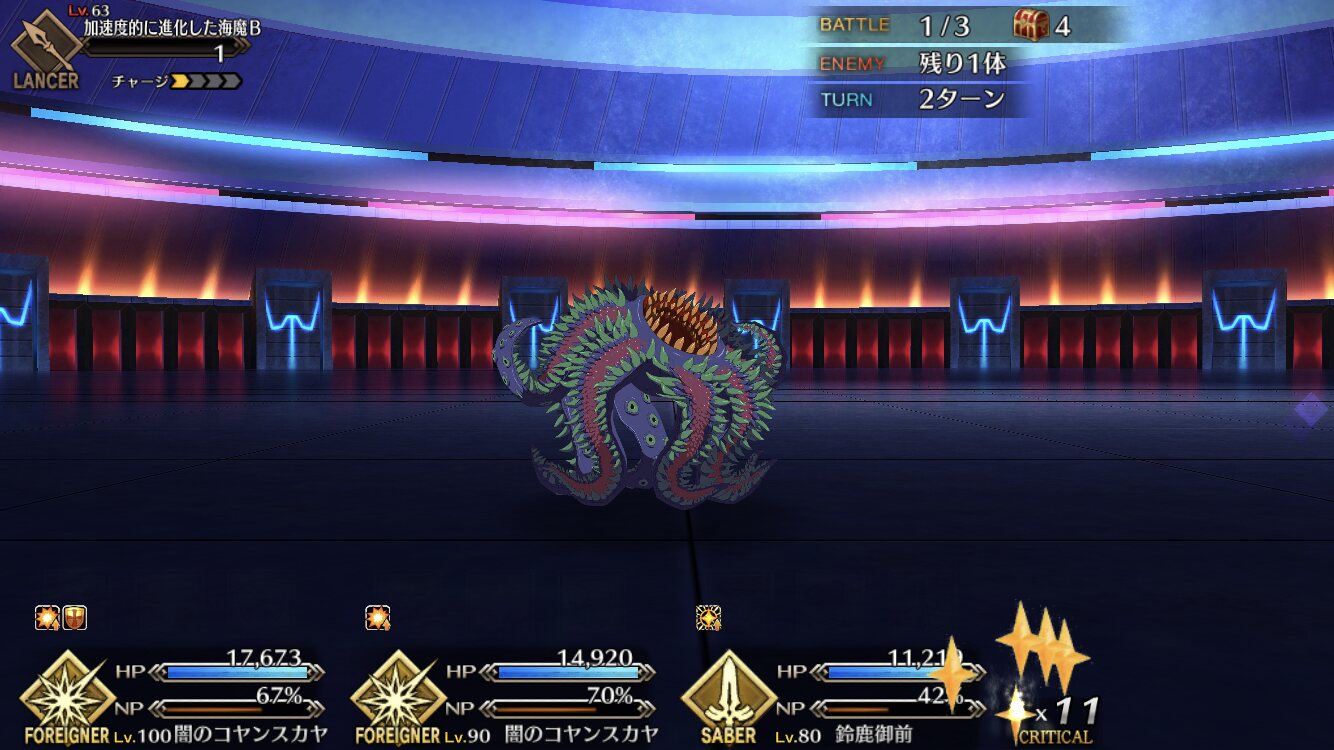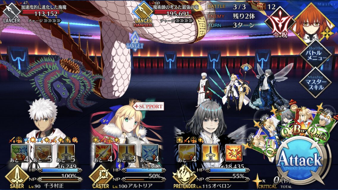 こっちはオベロンコヤンキャストリア(全部スキルオール10)とオルジュナがいるけどクリアできない…2wave目、変に宝具撃とうとするよりシグルドで殴り飛ばしで3wave目行った方が手っ取り早いことに気づいた