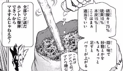 Dr.STONEについていえば、科学監修のくられ氏が出版物に書いた爆弾の作り方を真似てテロ未遂に使われた過去があるからか、真似されても危なくない程度にぼやかしてるみたいなこと言ってた記憶>>863