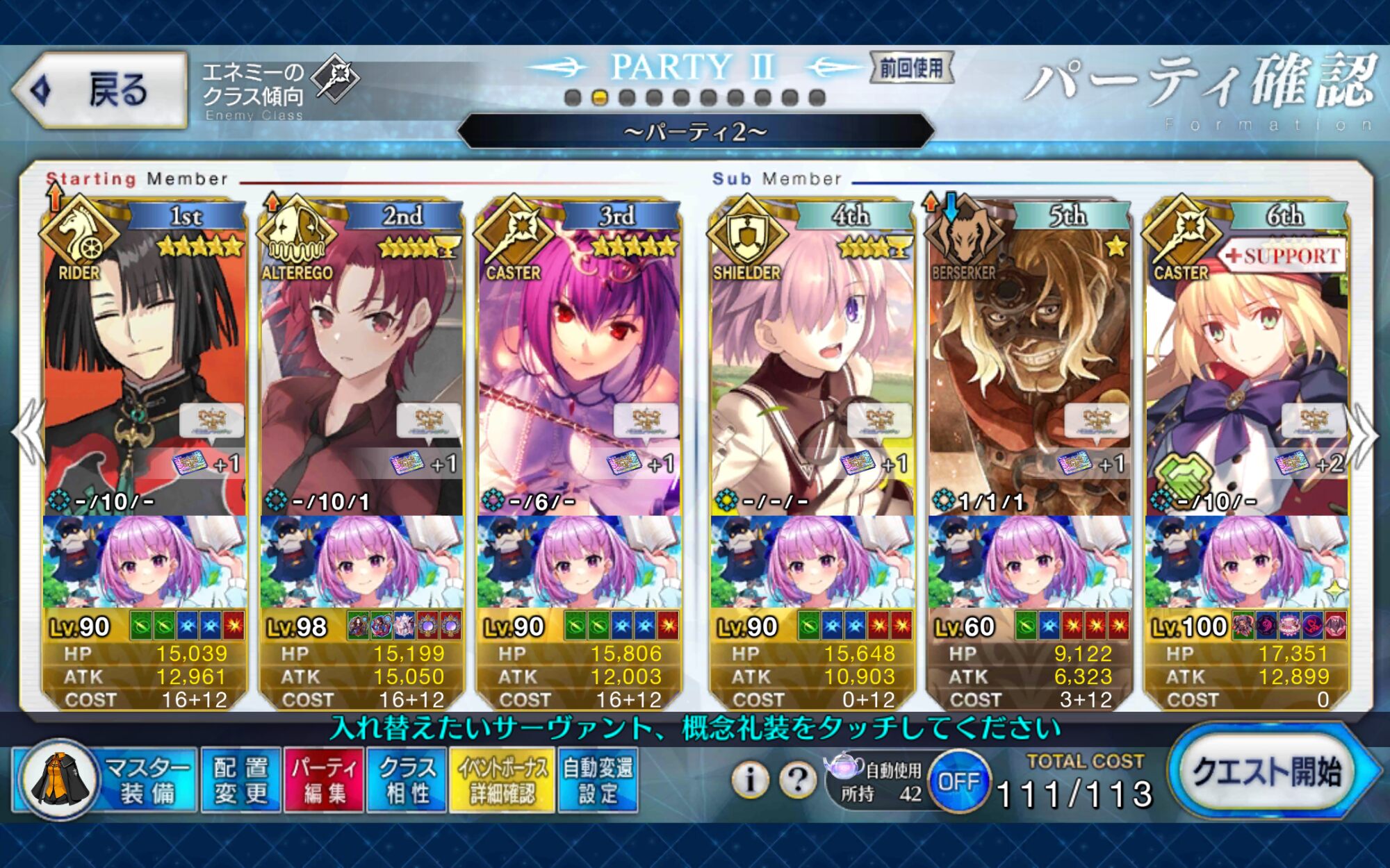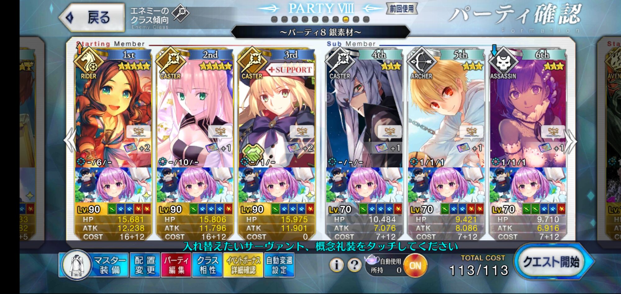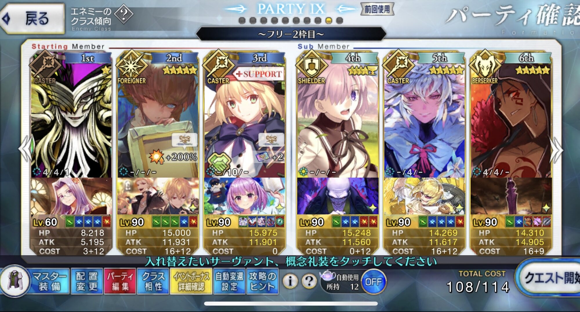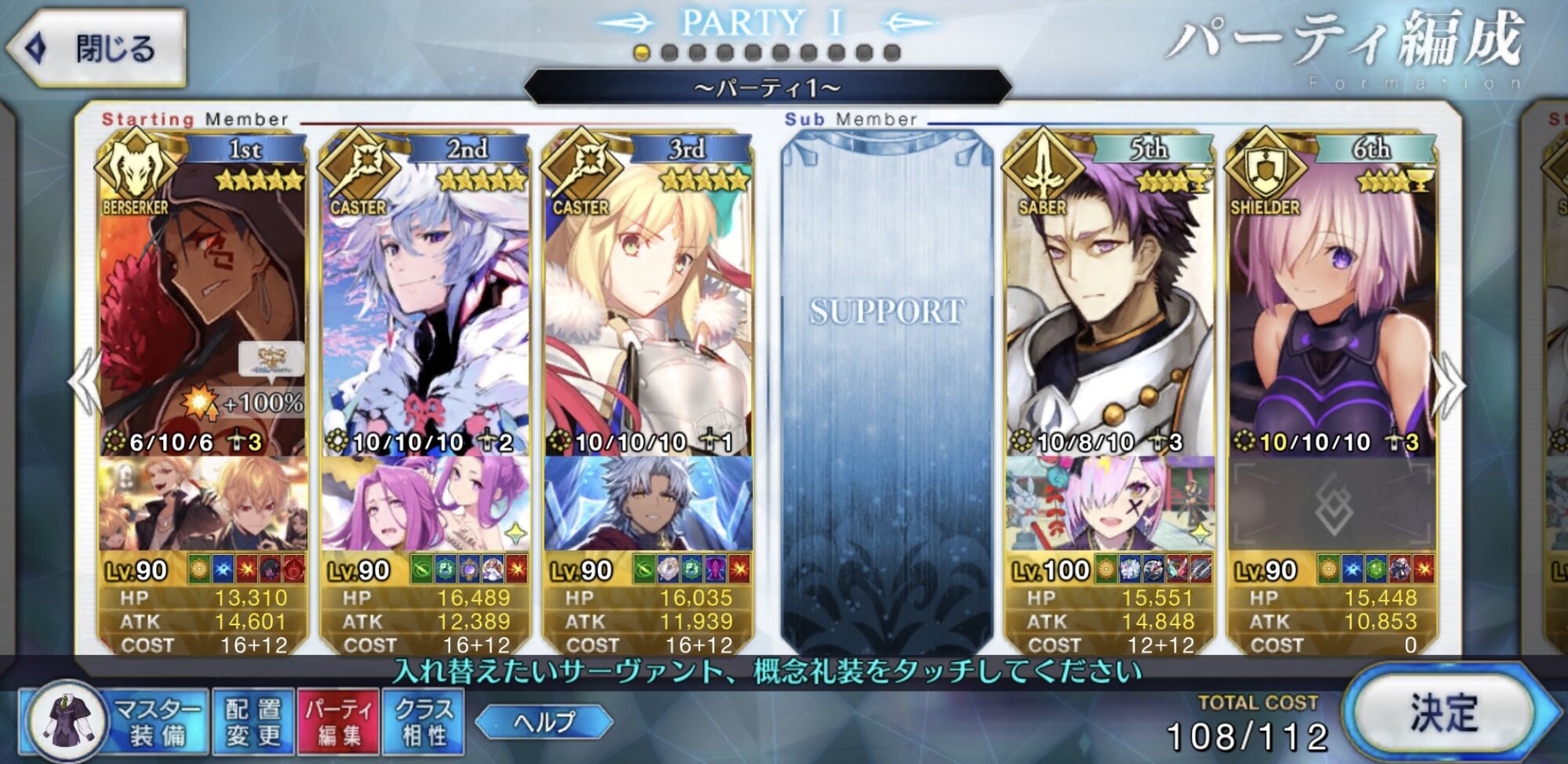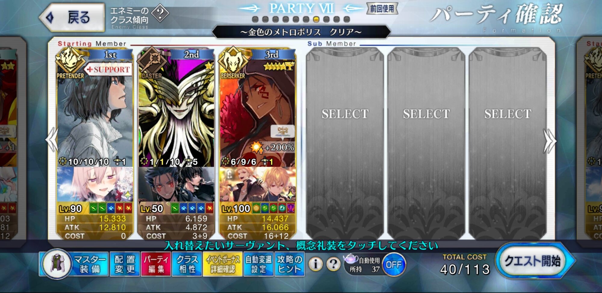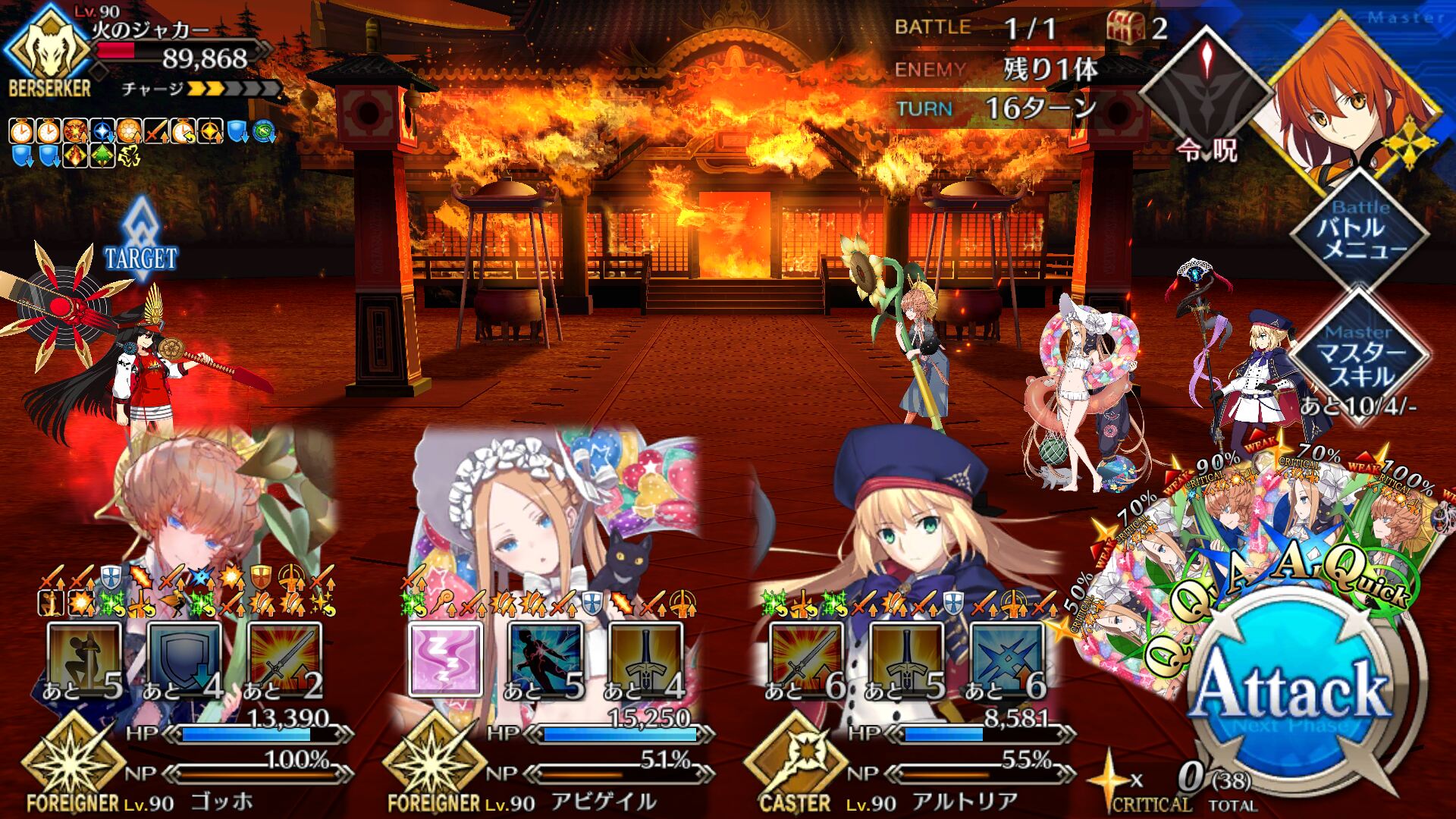 お疲れ様。これ、(特攻礼装含め)ガッツ礼装をどんだけ使うか、持たせる場合そのキャラだけで場を持ち堪えられるか否かで大分難易度変わるよね