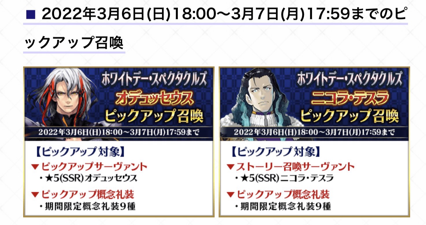 うーん素材とか教えて欲しいんだけど、仮に当日発表なら新規鯖とかどうしても期待してしまうが(オデュッセウスもテスラも先日ピックアップしたばかりだし)19時過ぎてもまだお知らせ更新なし