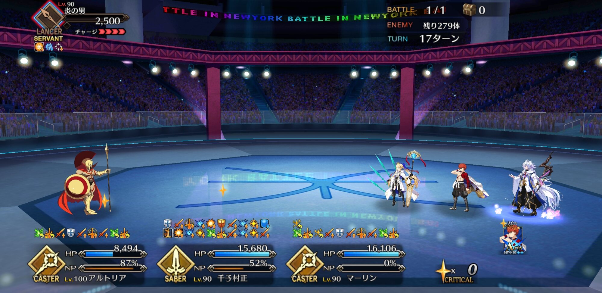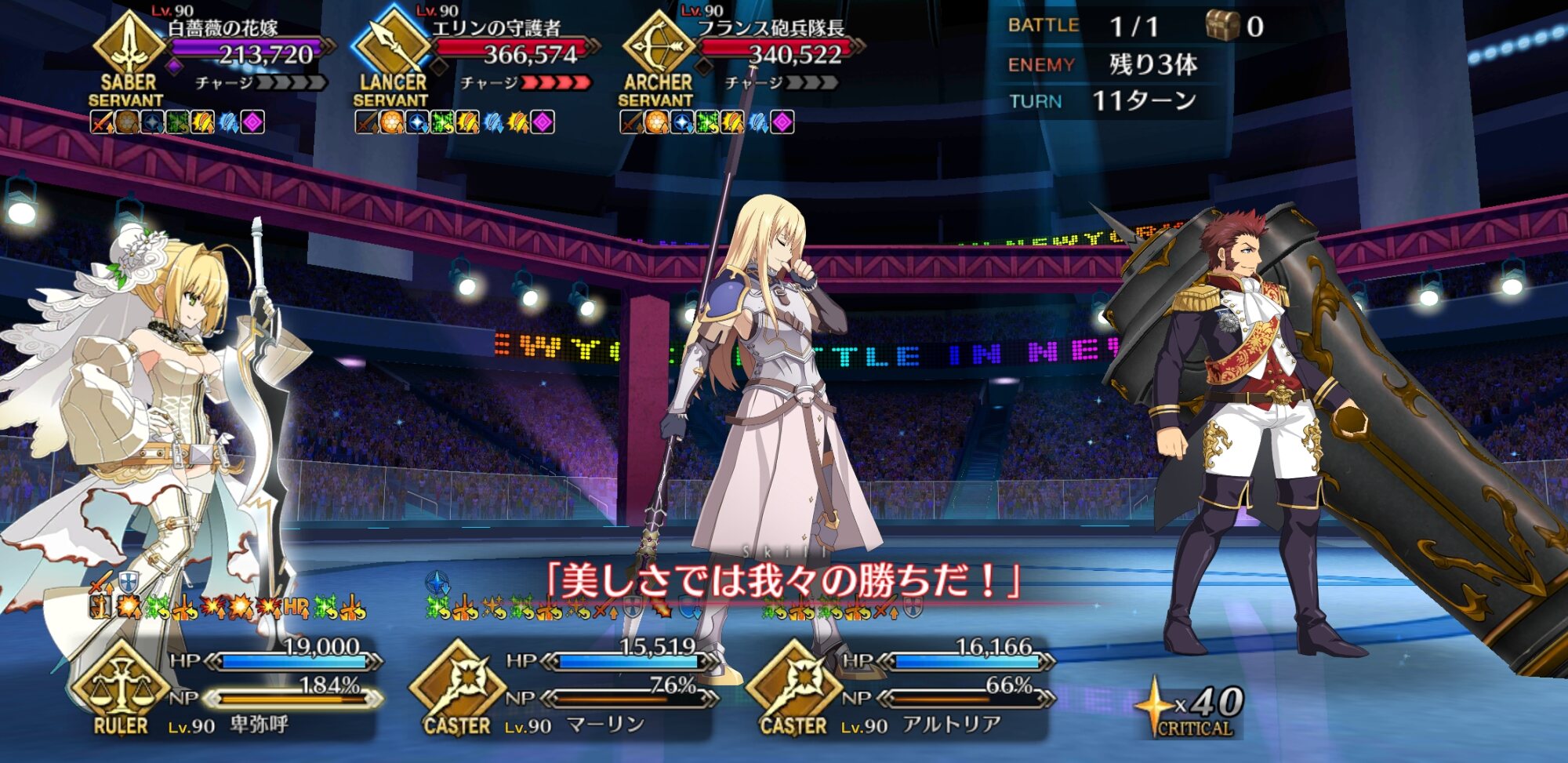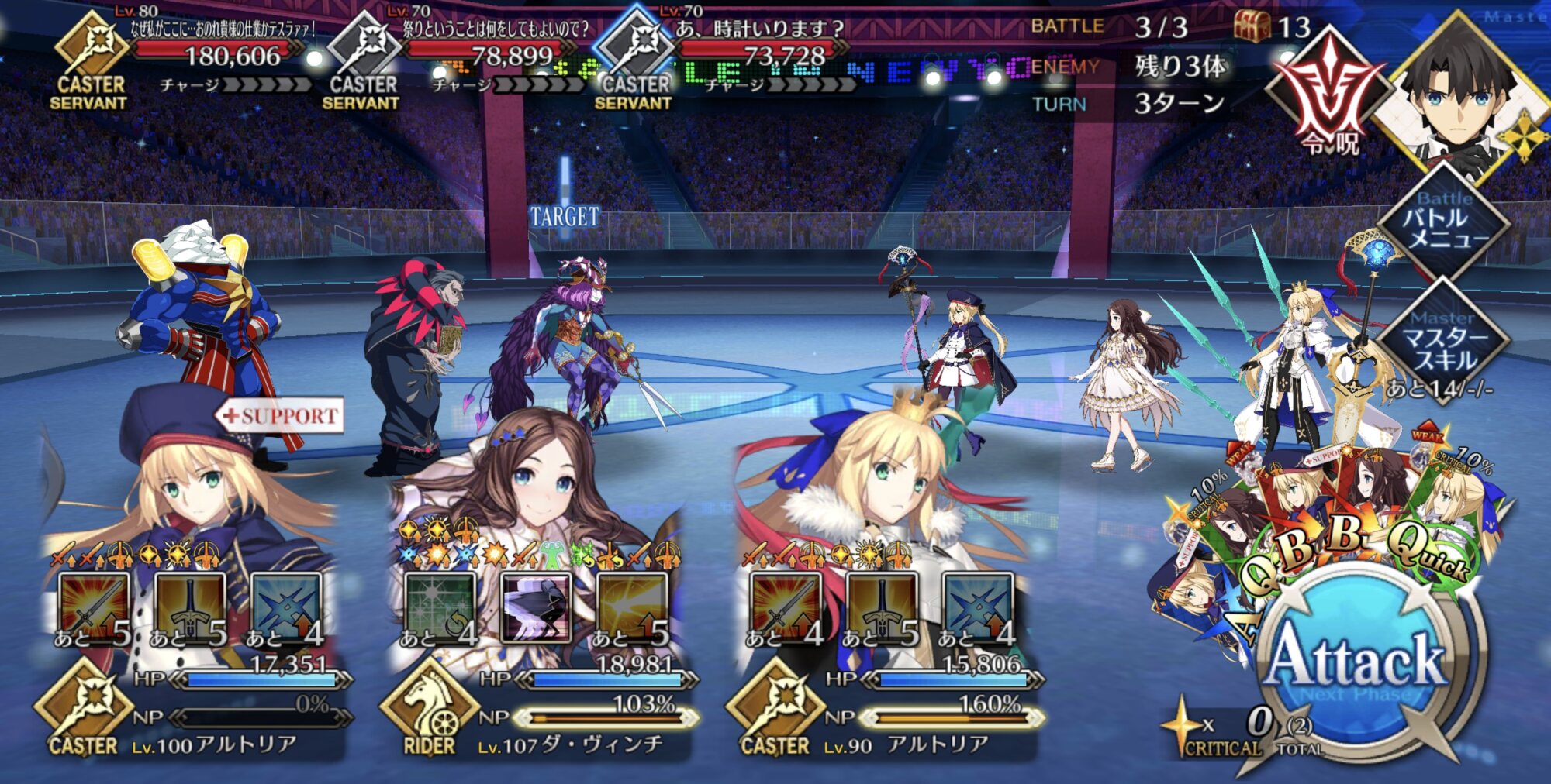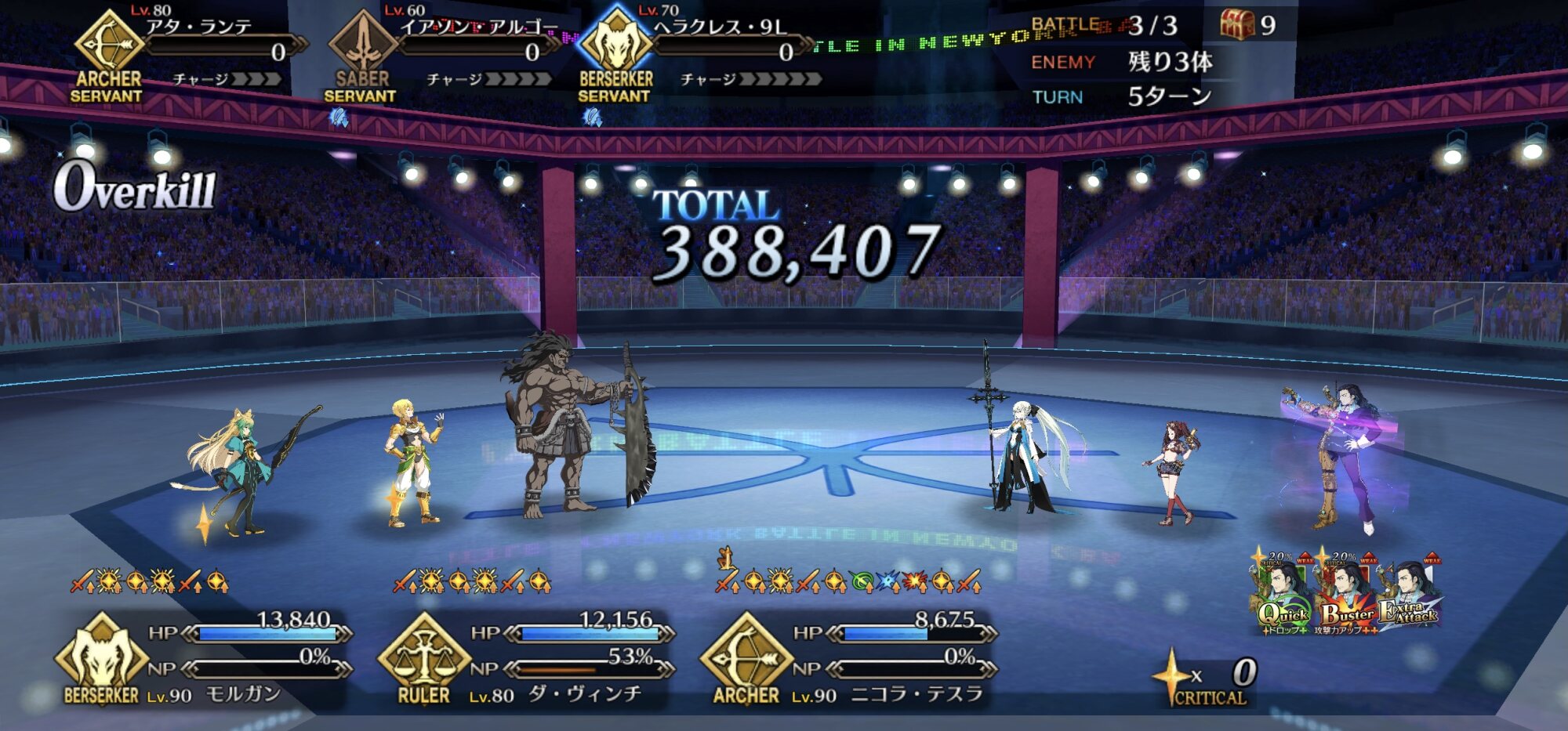 今回の前衛は皆ガッツ(歴代のボックスイベの特攻礼装)だったので、いつも以上にNP回りを気にしながらプレイする必要がありました。
