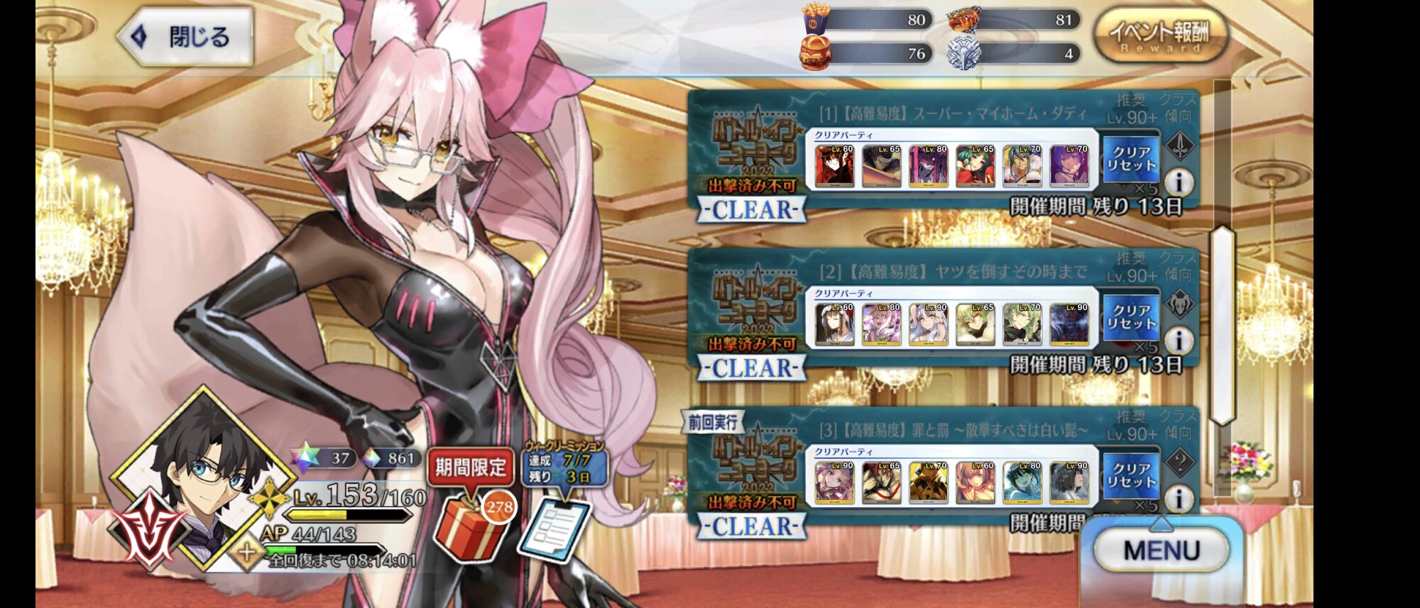 クリア率1桁台とか覚悟しとこうボックスガチャでつつくことになるのは、オデュッセウスの雄っぱいとテスラの雄っぱいのどっちだ