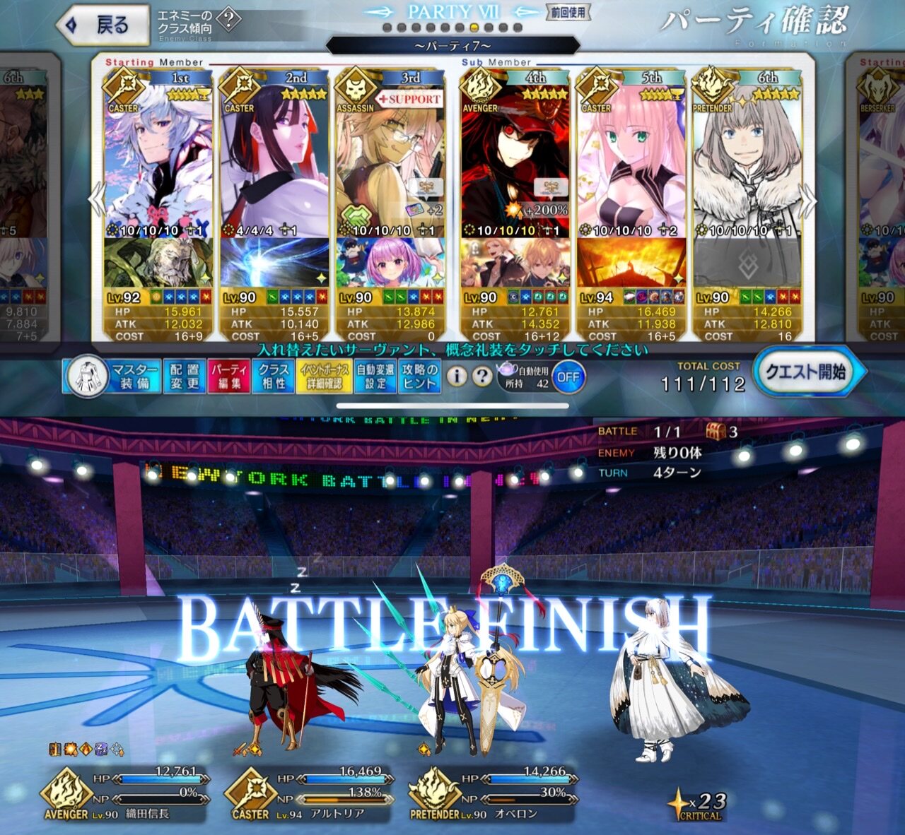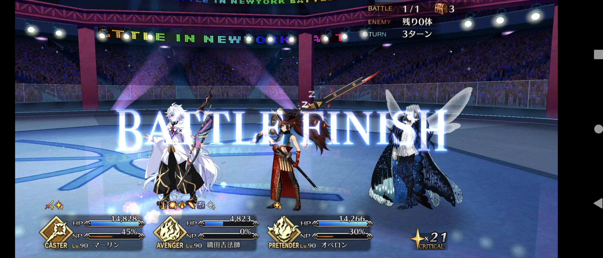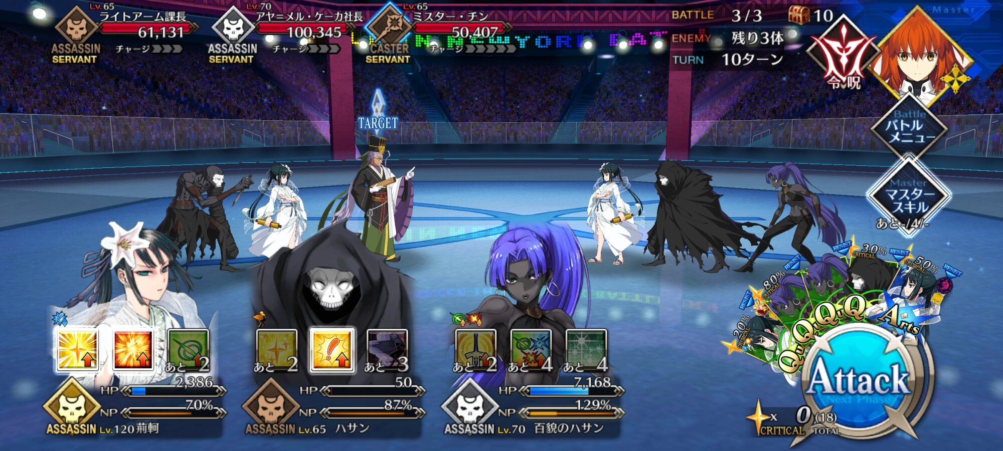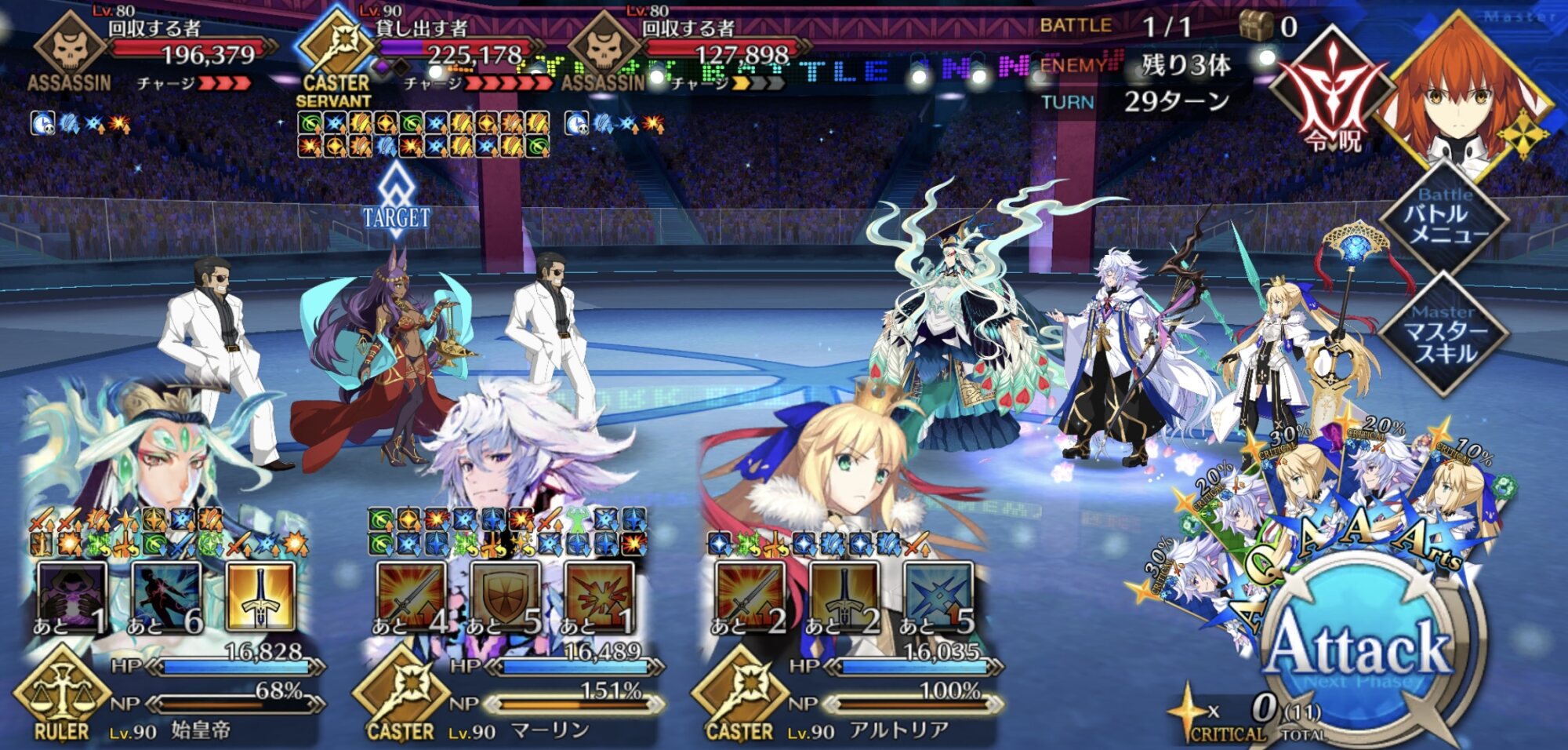 メインアタッカーに魔王ノッブ、サポート兼盾役に始皇帝、控えに道満で三姉妹クリア。性別不明も割と増えたなあ