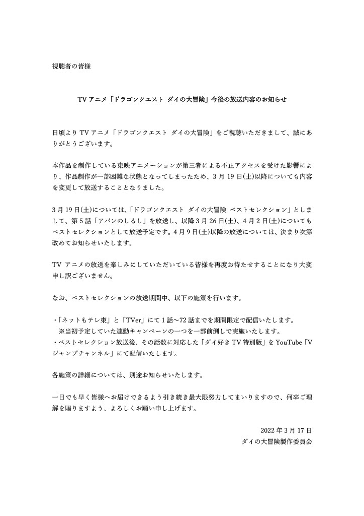 ダイ大は4/2まで影響出るの確定で4/9以降もまだ未定かあ……