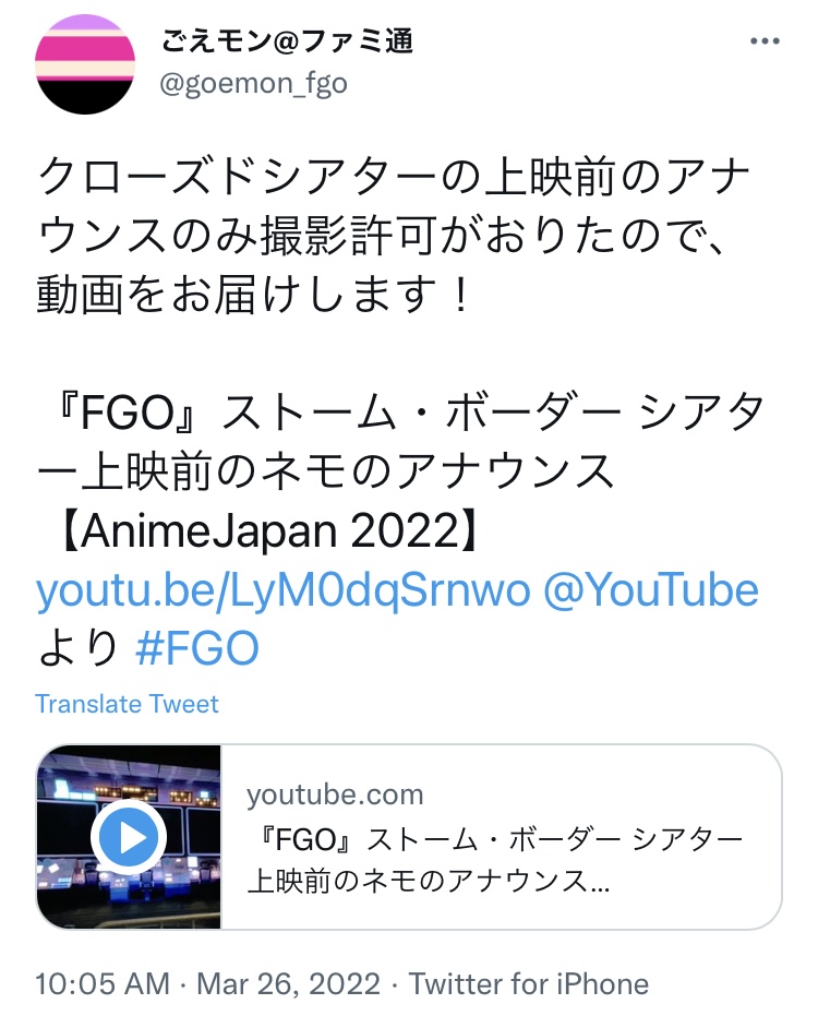今までFGOは4時以降生放送ばっかだったからそれに慣れてしまってアニメジャパンの生放送時間勘違いしちゃうとヤバいな。>>19