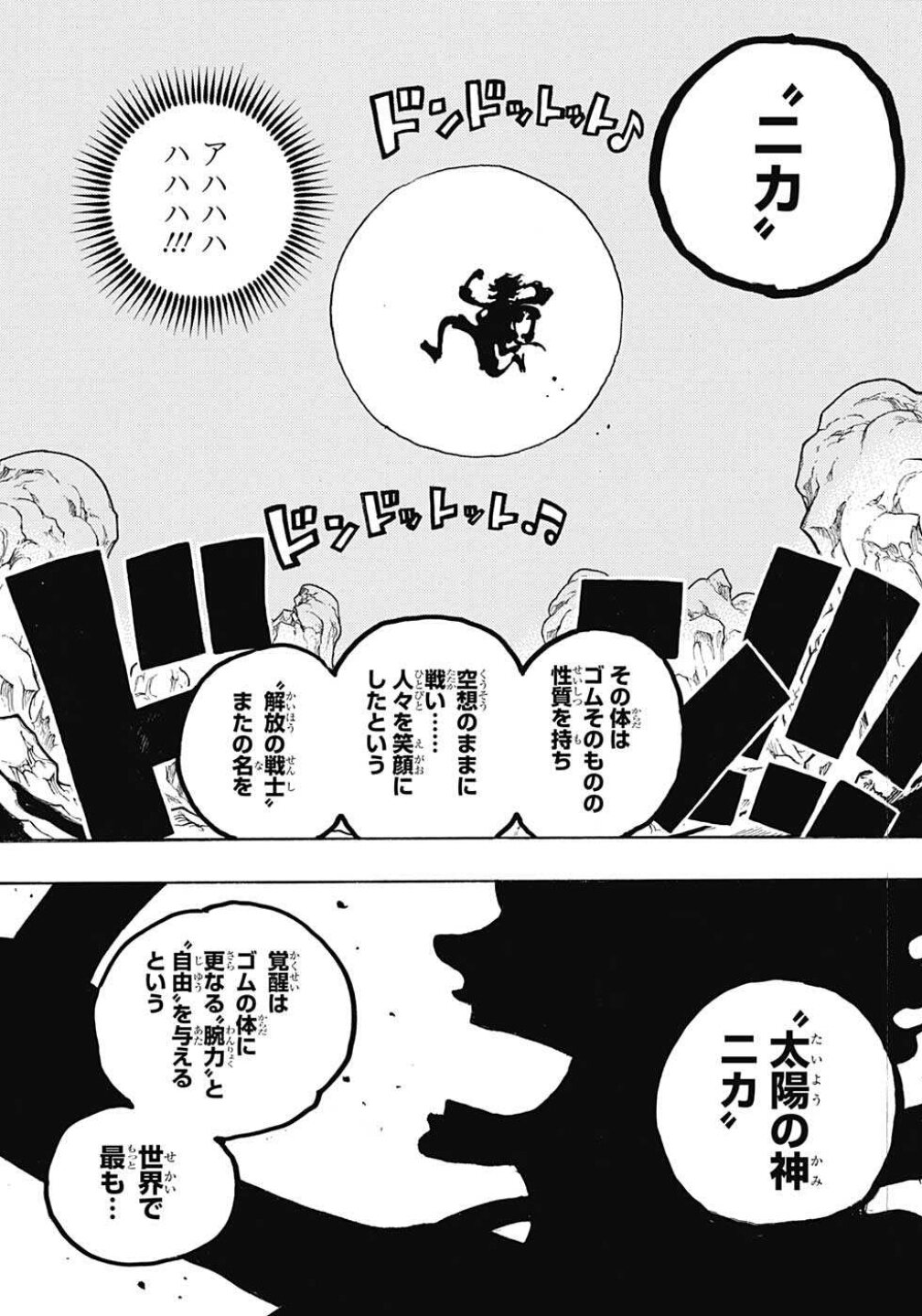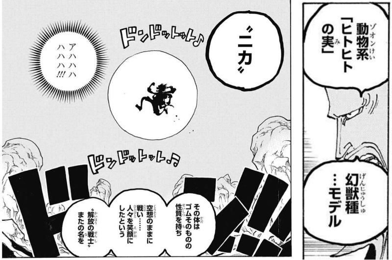 元々はゴムゴムの実だったけど、ニカが食べて死去した後「ヒトヒトの実モデル幻獣種ニカ」に変異したとかだろうかねえ?「オレの最高到達点」と言っているが、おっちゃん知ってるよ