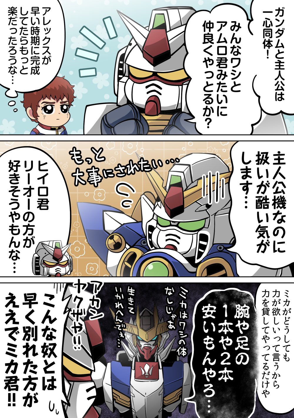 主人公機といえば、やっぱりGガンダムの交代劇は何度見ても挿入歌も相まって感動するんですよ……この抱き抱えられてるシャイニングガンダムが女性らしく見える一方で、ゴッドガンダムが雄々しく抱えながら立ち上がる絵は本当に美しい>>921