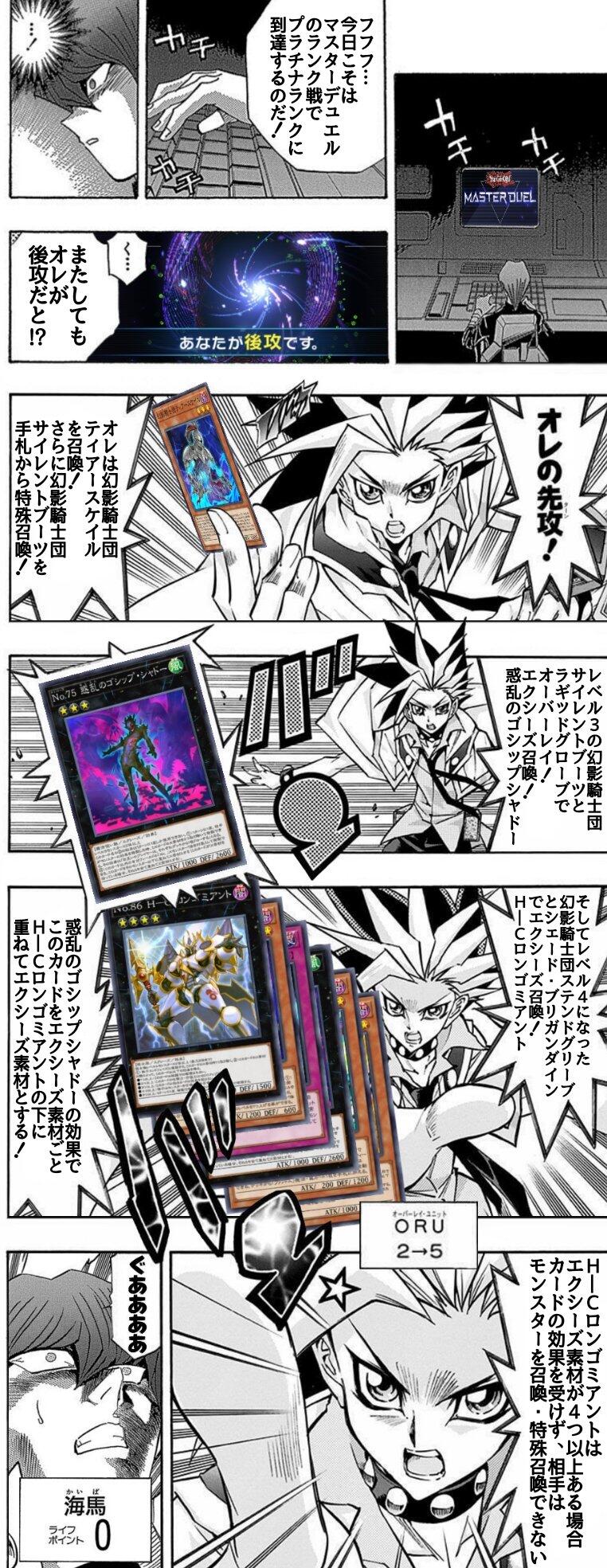 昔やってたなあ。楽しかったけど、ドローカードばっかりになっちゃったり、自分でやると思いの外ルールミスしちゃってたりで今気づいてしまったんだけど、素材5のロンゴを立てる時に使われるゴシップ・シャドーもナンバーズで、ロンゴ自身もナンバーズだから、ゼアルの二次創作で普通にやろうと思えばやれちゃうコンボですね、ロンゴ&ゴシップって。