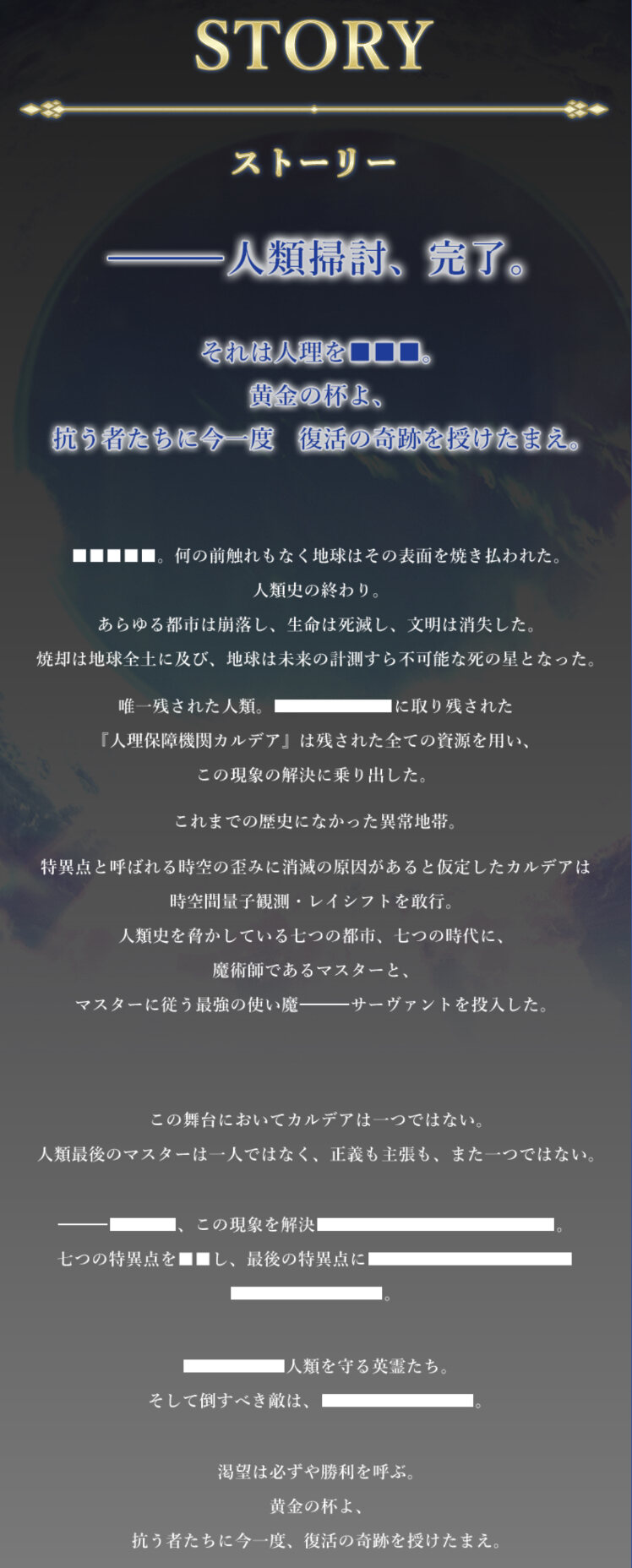 そもそもアプリ版の世界を観測して模倣してる世界って部分が抜け落ちてる人が居るからこの世界にソロモンないしゲーティア居ないのに何でこの世界作れてるのなんて疑問が出るのか。遠い未来において「魔術」が人間にとっての悪になった時、これを滅ぼすためにソロモンが用意した安全装置とも言える。己の姿や功績が二度と地上に現れない以上、英霊の座からも消滅し、ソロモン王の痕跡は世界や人類史から全て消え去り、人類では誰も到達していない終わり、本当の意味での「無」に至る。