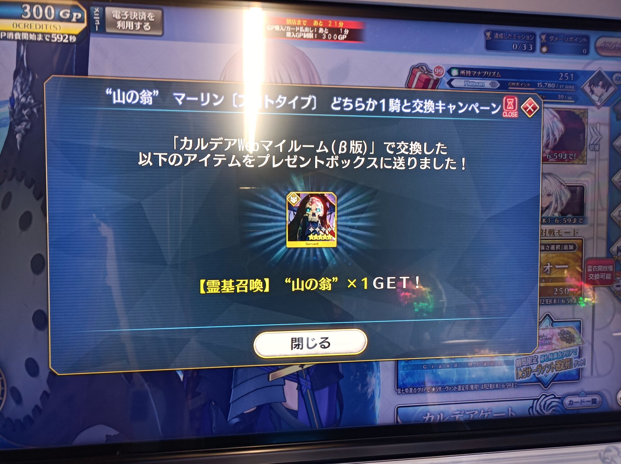 結構やったなぁとぼんやりマイルーム見てたら、プーリンと翁がもらえるキャンペーンのポイントが350になってて、俺は一体どれほどグレイルウォーやってたんだと寒気がした……。ちなみに一切ガチャは引いてない。なんとか2000位以内に入れた…一緒に戦ってくれたマスターありがとう…