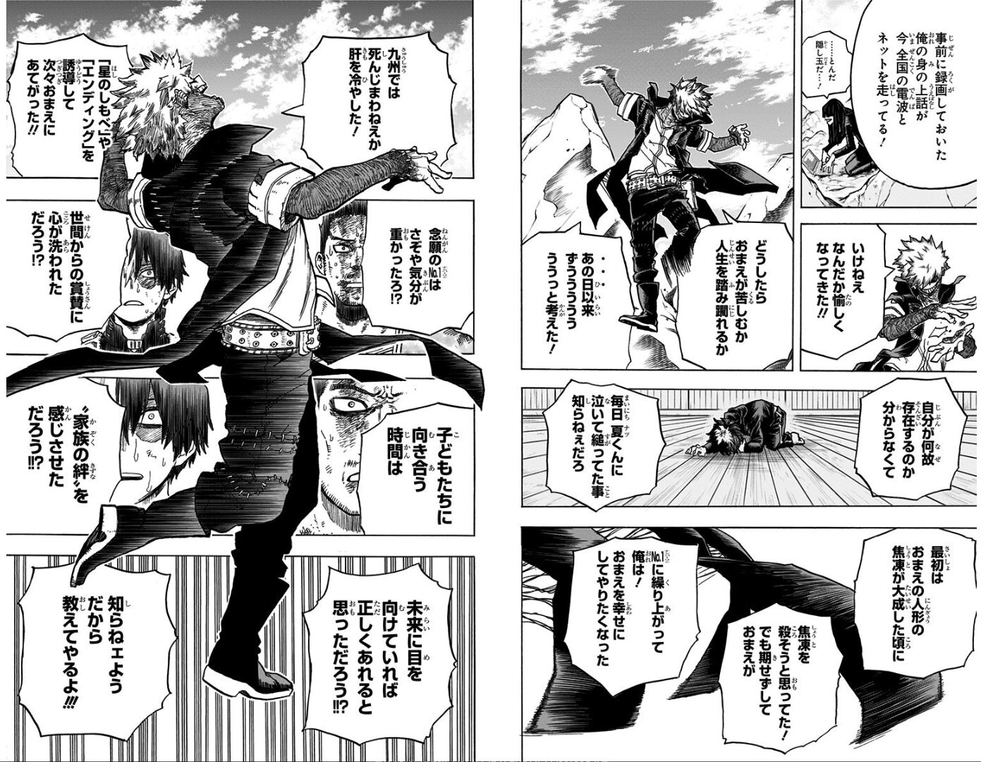 まったく天の邪鬼なことで、非常に全体の流れに反逆してホント申し訳ないんだが、この土壇場に来てヴィラン連合側の方に感情移入してる自分がいるんだ。堀越先生は殺る時は普通にやるから荼毘平気で死・なせそう。エンデヴァーは間に合わない男みたいな感じにしてきそう堀越先生だったら。