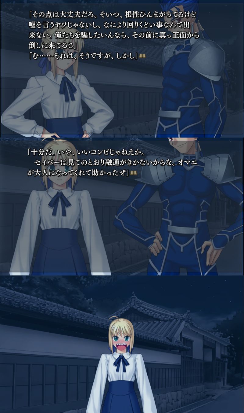 概ね >>895 コレなんだけど、付け加えるなら鞘セイバーについてはこの2部キービジュアルが最初に公開された確かAJでの生放送で鞘セイバーについて触れられた時に川澄さんがまだ何も言えないって反応をされたんだよね