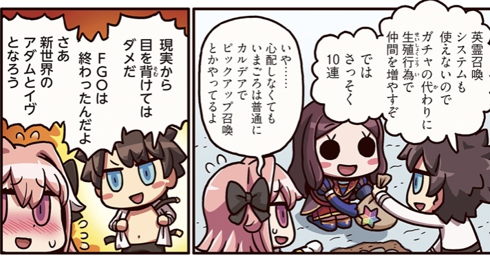 完全に主観ですが征服王は自発的に自意識的に奉仕を望まなくても周囲が王よ夢よと望む望まぬ関係なく奉仕されている。ここからイスダレに走りたいのだが、奉仕を望む事は自由から離れてしまうのでは?通常なら思う訳がない事を波斯王に抱いた。けれどそれは生きてこそ、クチナシに奉仕活動はできない。金策の為に、ポルノ映画を撮ることになった一行だったが、出演してくれる女性鯖が見つからず、ぐだ子とマシュの2人が出演することになるのであった。