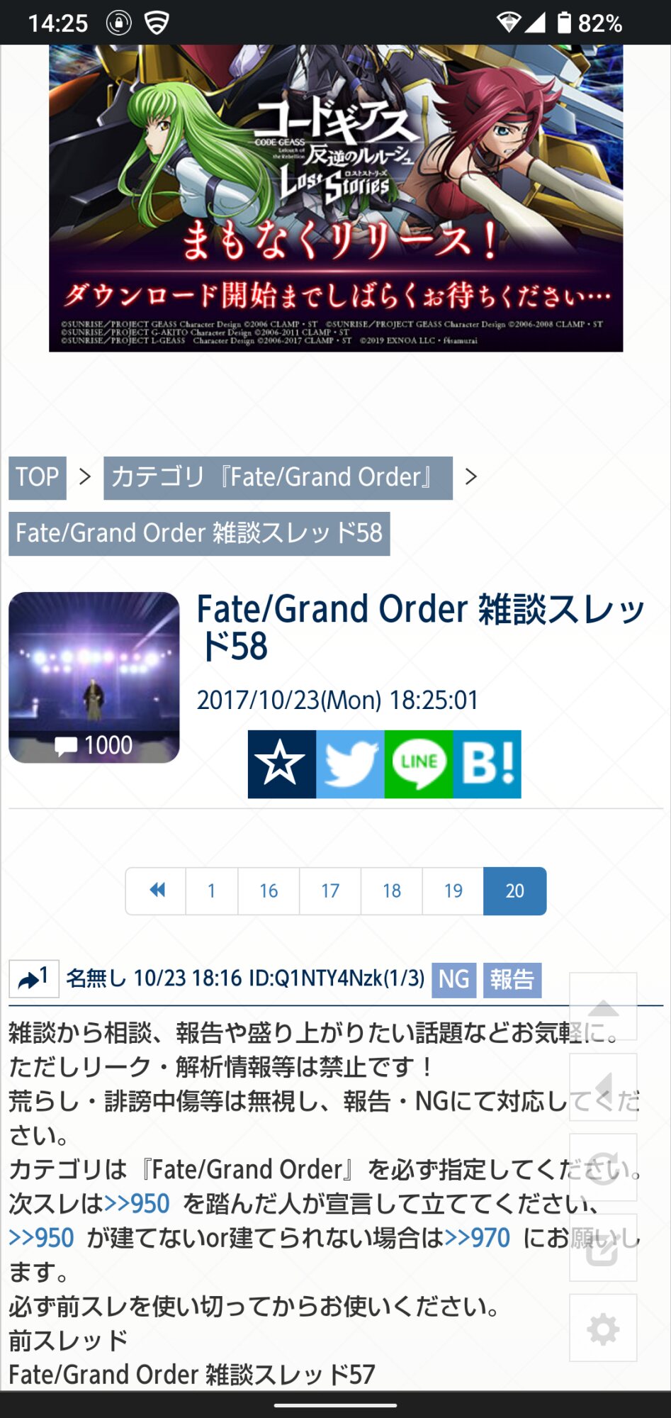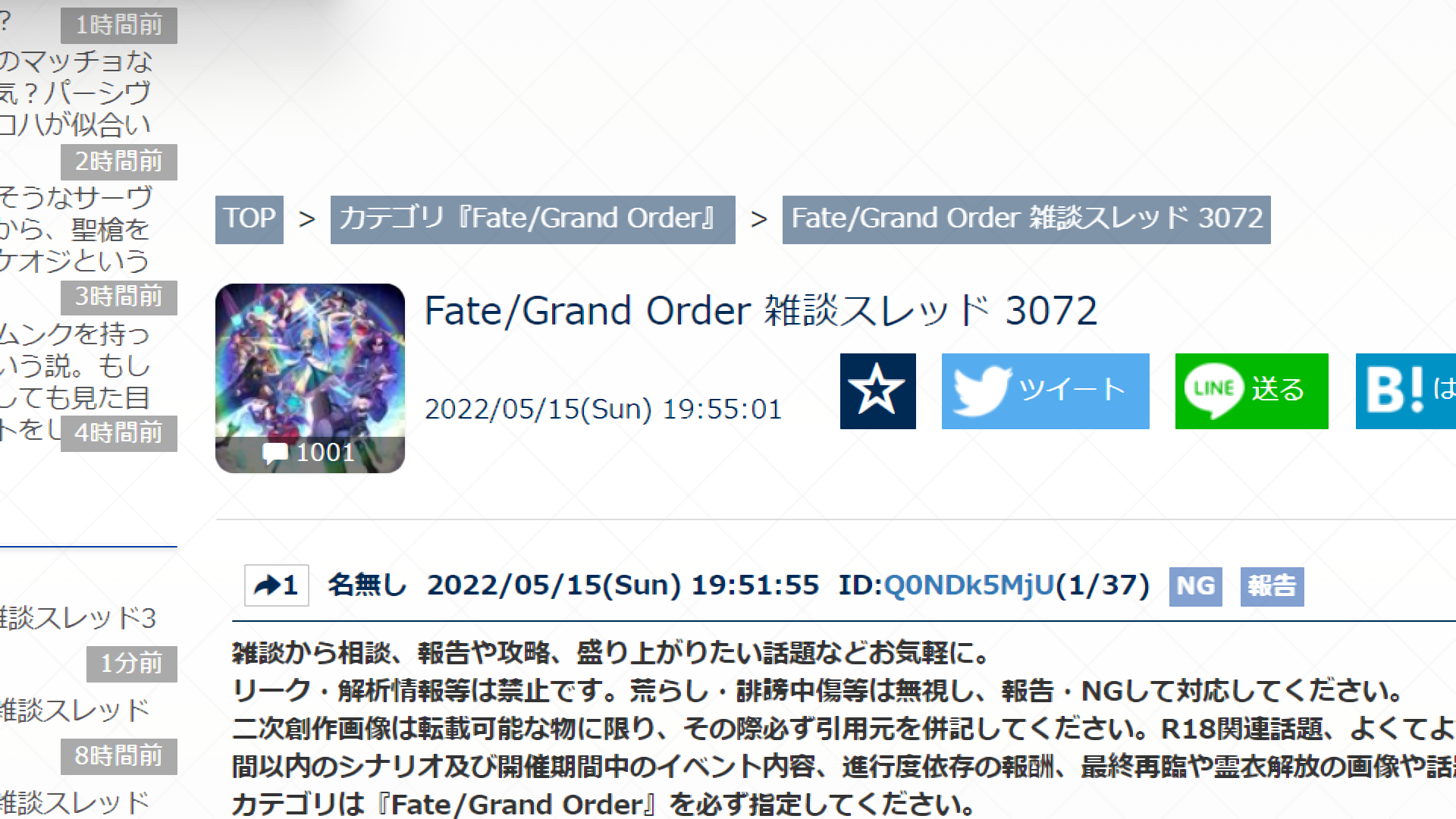 二次創作画像は転載可能な物に限り、その際必ず引用元を併記してください。R18関連話題、よくてよ無しのガチャ結果、実装から二週間以内のシナリオ及び開催期間中のイベント内容、進行度依存の報酬、最終再臨や霊衣解放の画像や話題は専用スレにてお願いします。