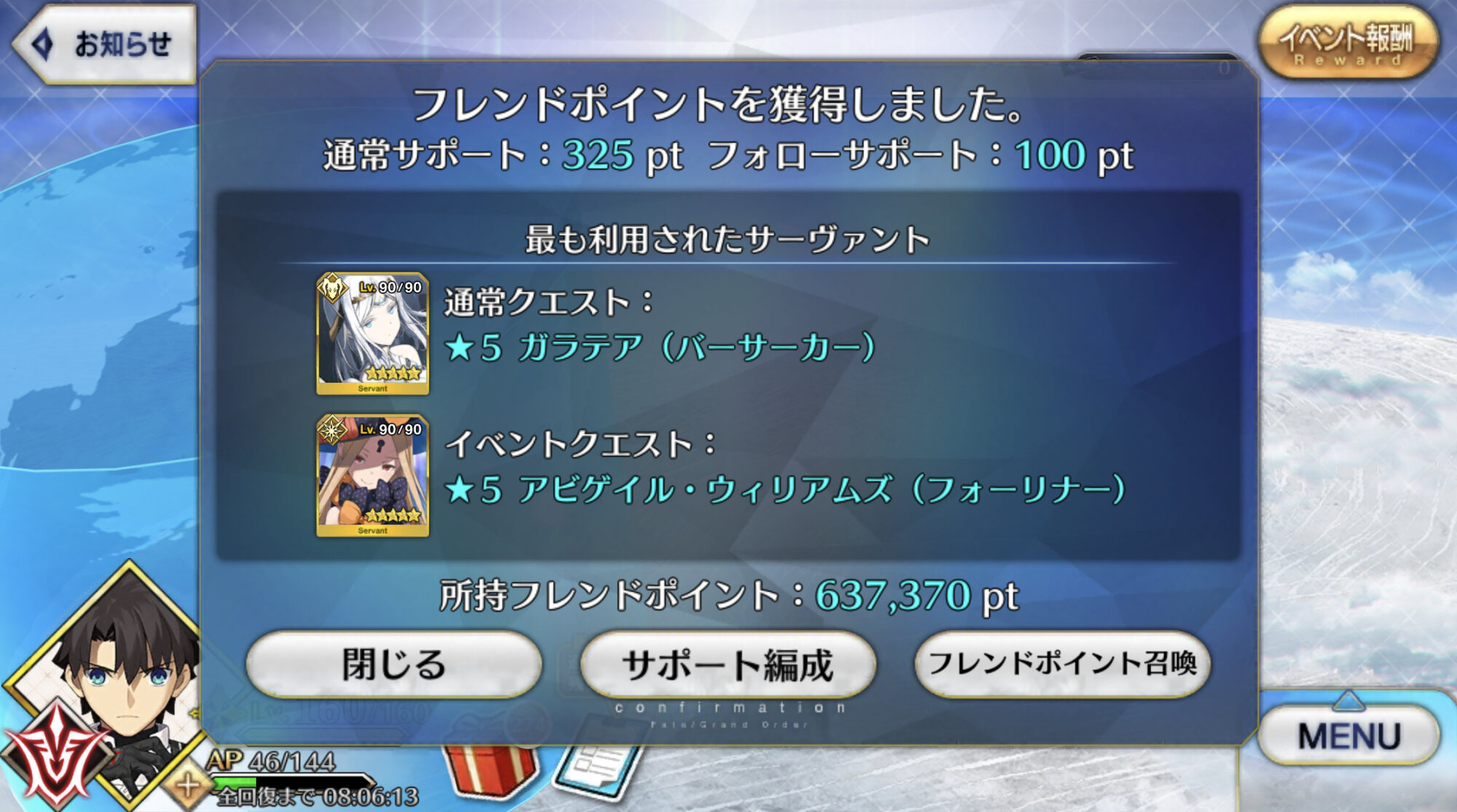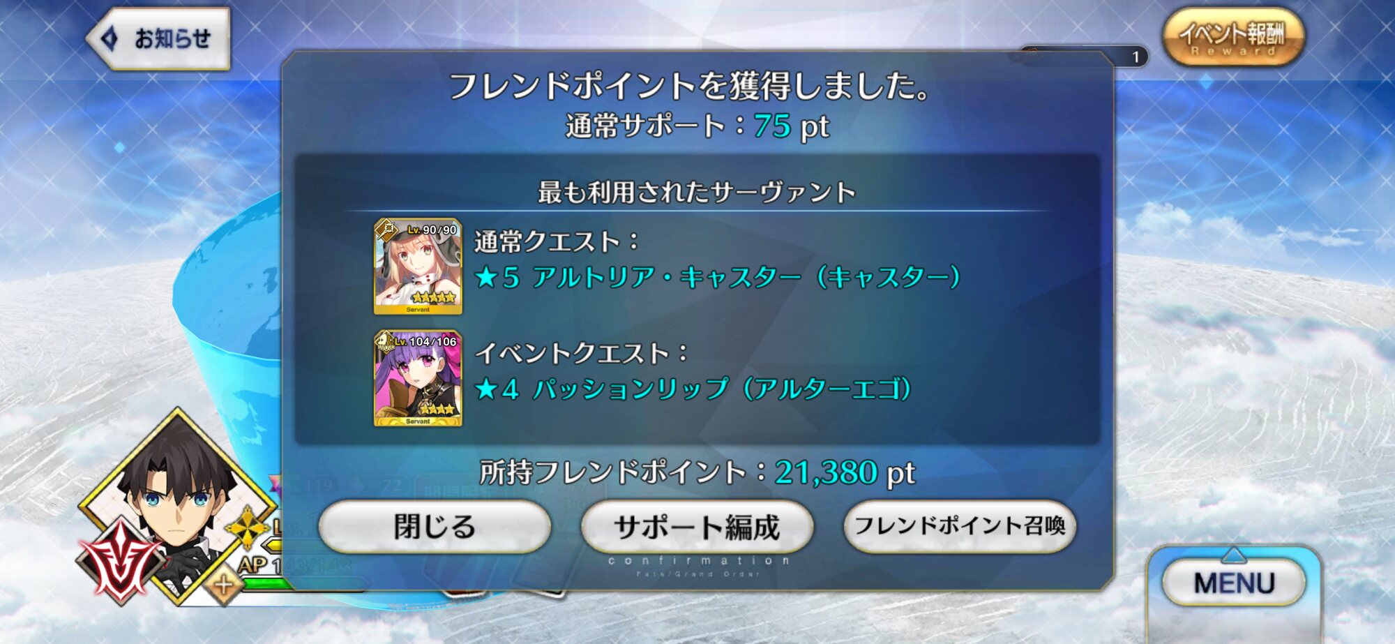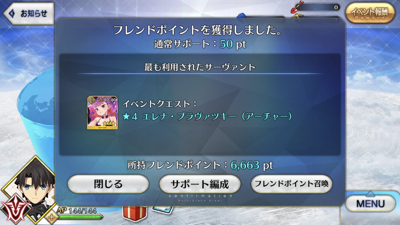 アンケに銅素材乱獲させてくださいって書いて良かったなと思ったイベントでした(フライング)呼符10枚やったーと思ったらログイン忘れあったみたいで終了しました。