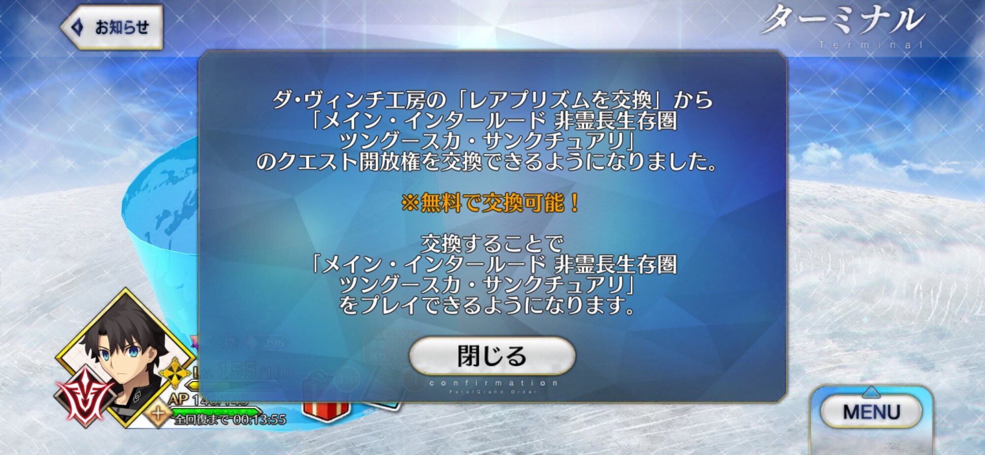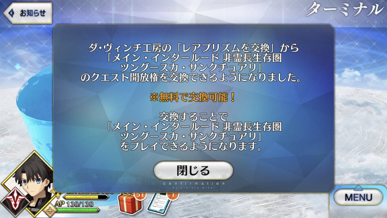 確かメガネイベント開始で妖精國まで終っている人。はやくツングースカクリアして、コヤンと大統領とネロとシオンさんが溶鉱炉に沈んだとこまで見届けてトラオムに備えよという公式からのお達し