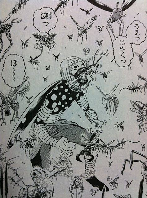 ・本人も昆虫に似た体質で背中の羽で空を飛び、百万個の複眼を備え脅威的なな動体視力は疎か、微弱な電磁波まで捉える。切り離した体の一部は暫く動き回り自在に動かせる上にこれ自体の戦闘力も高い。牙を持ってるが卵を産む時に邪魔なので普段隠してる