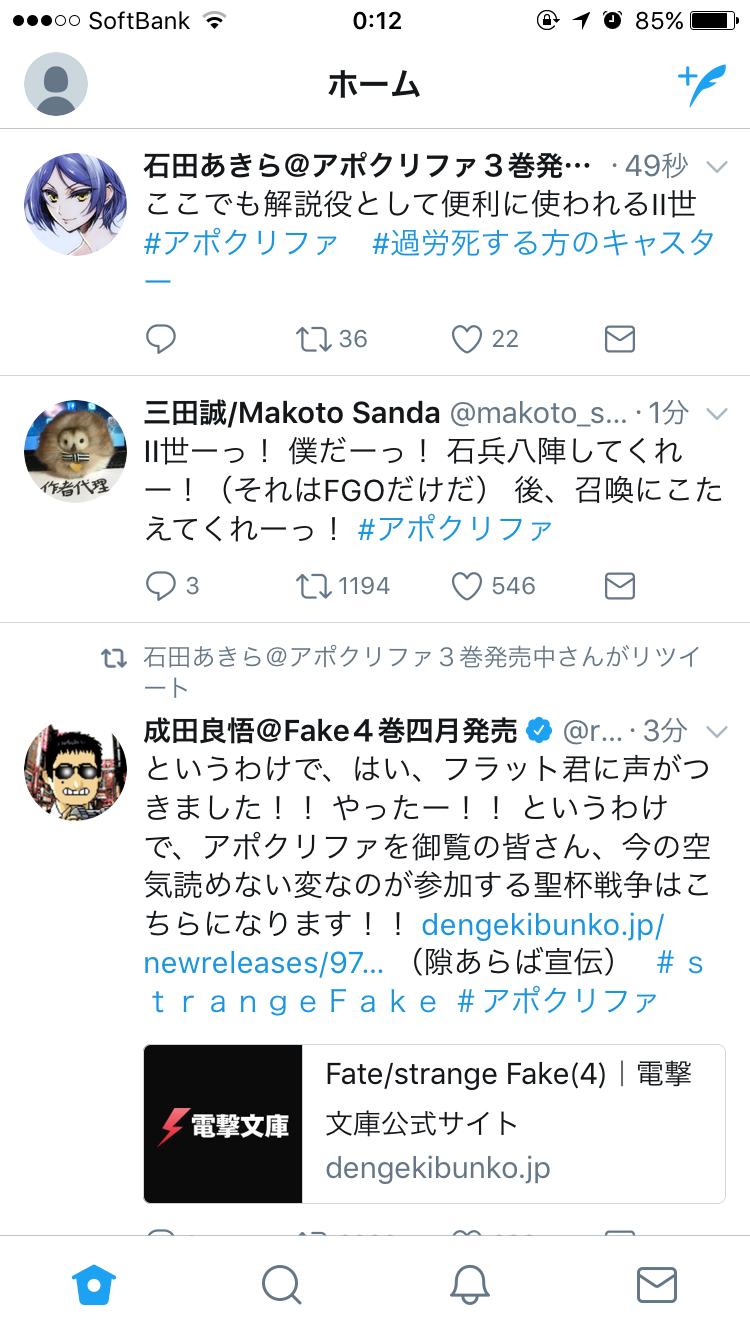 てか、SN(HF)、Zero(これは名前だけ)、EXTRA(エリちゃん)、FGO(実装マダー)の話題が30分で大体出るってガチすぎない?