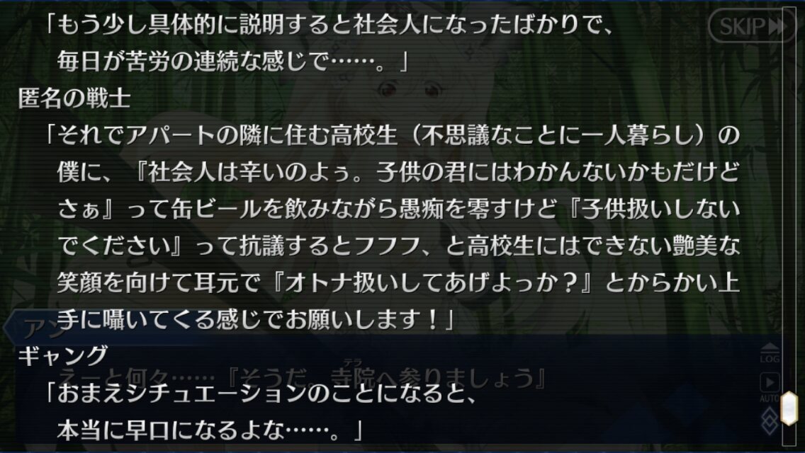 ありがとう、ありがとう……学生さんっぽいからあんまりお金ないだろうに無理しないでね…………気に入ったらオルレアンと北米も面白いから余裕があったらよろしくね…………掘れば掘るほどトンチキが出るFGO!まさに頓珍漢の宴だな!