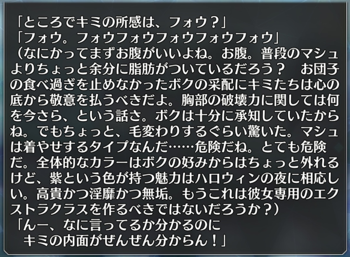 マテリアルには結構開けてプラシーボってしてあったけど、楊貴妃の反応とか、プラシーボにしても邪神がいて意気投合した事自体がプラシーボなのか、邪神と意気投合したってのがプラシーボで実は中身はニャルなのかとかはイマイチわからんのよね。まあ、バレンタインのどう解釈するかは任せるってのが答えだと思う>>120