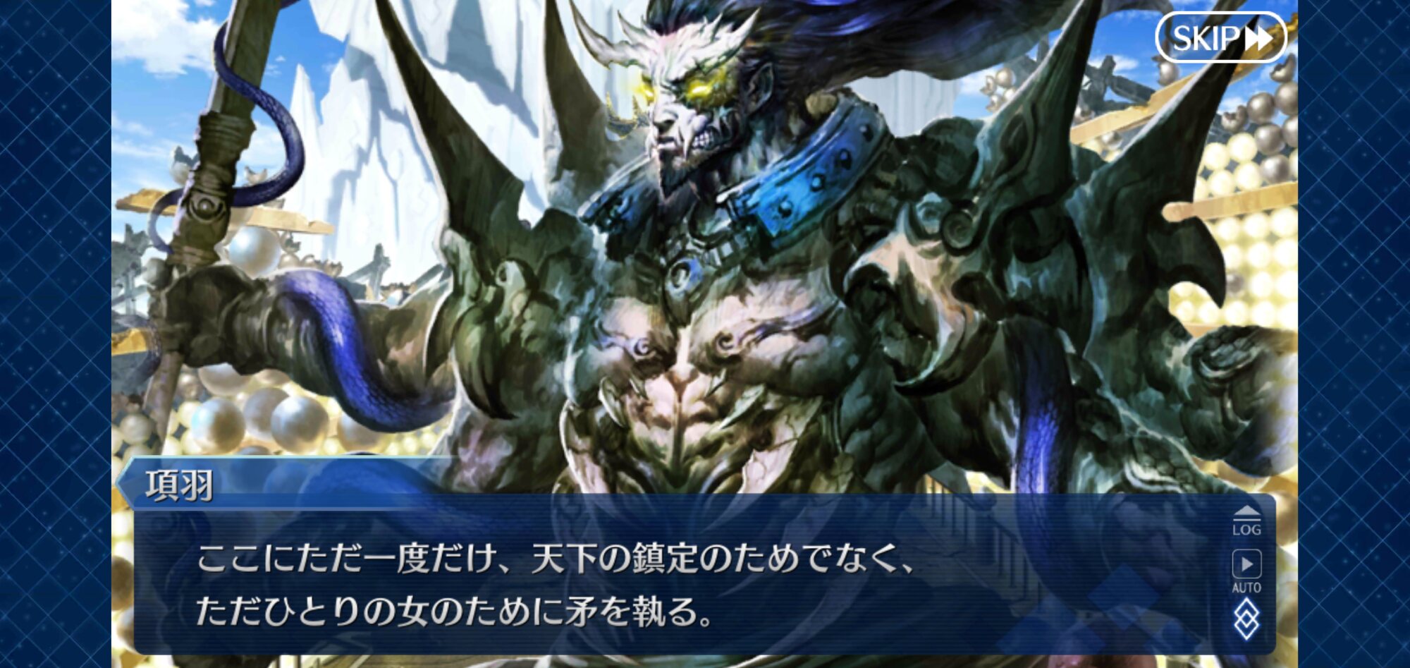 項羽様はどんな世界でもどんな姿でも虞美人を好きになるってのがいいと思う。そしてこの項羽様は最後、虞美人の行く末を憂いたまま眠りについたのも悲しいけど好きです(カルデアにいるのはあくまで汎人類史の方)。SNだと迸る魔力の圧とかだけで、これは人間が敵う相手じゃないみたいな描写が結構あった気がするんだがなぁ…