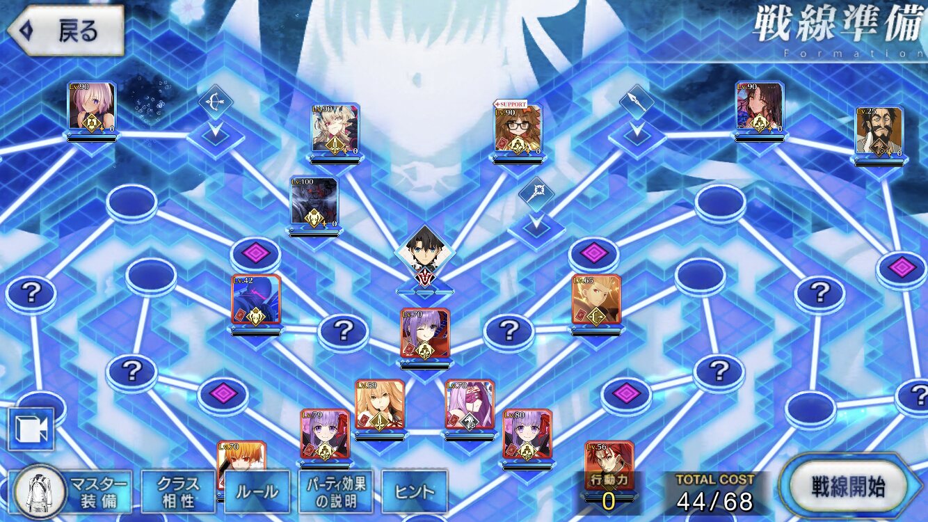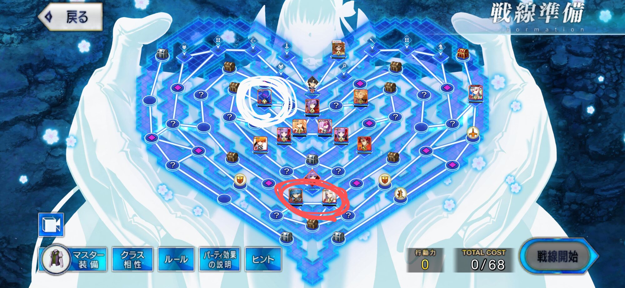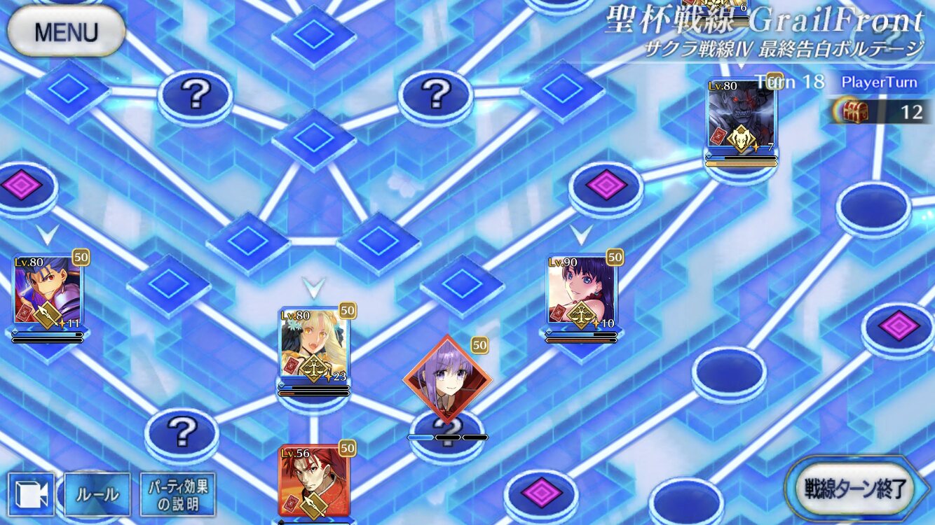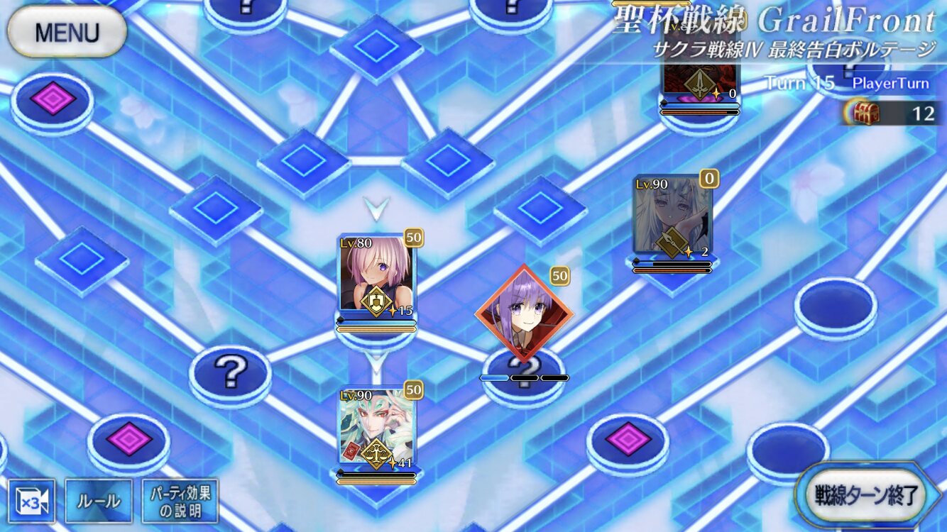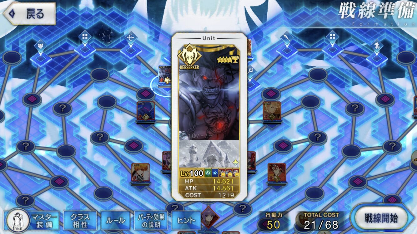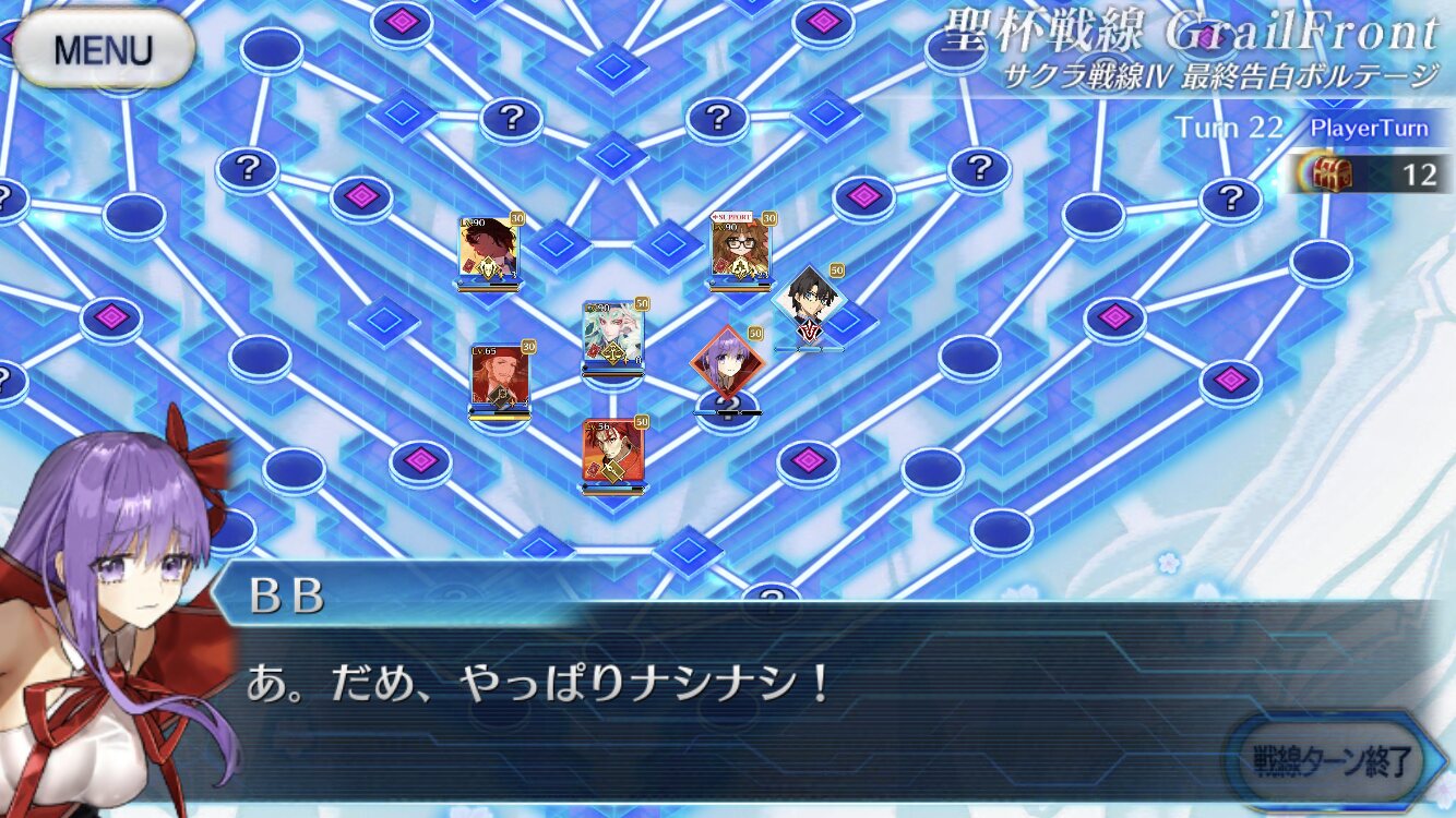 ・中陣は3騎をそれぞれBBスロットマス(?マーク)に一列に並ぶように向かわせる、狂と騎はその周りでPT効果得られるように配置