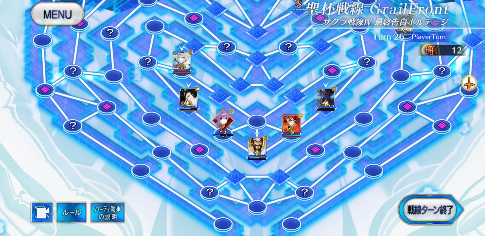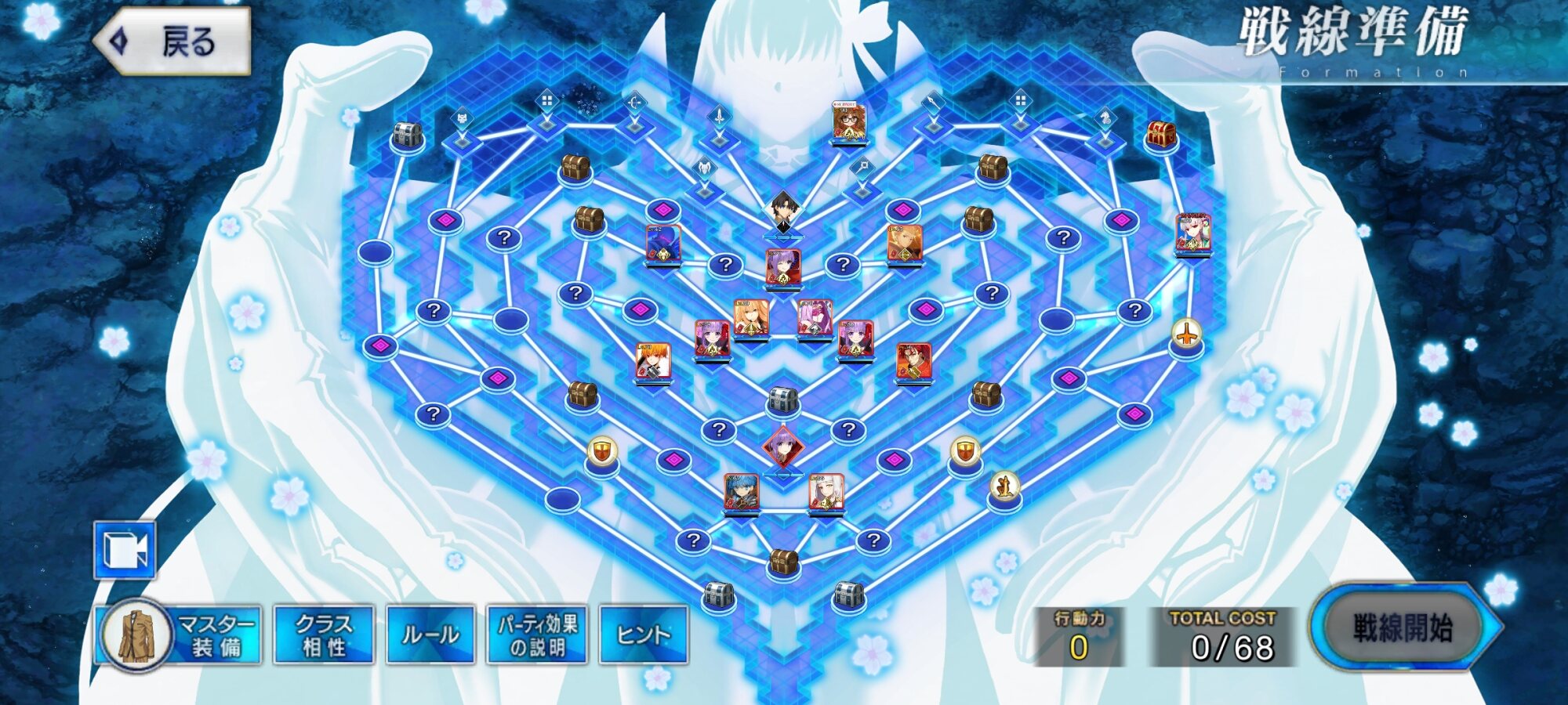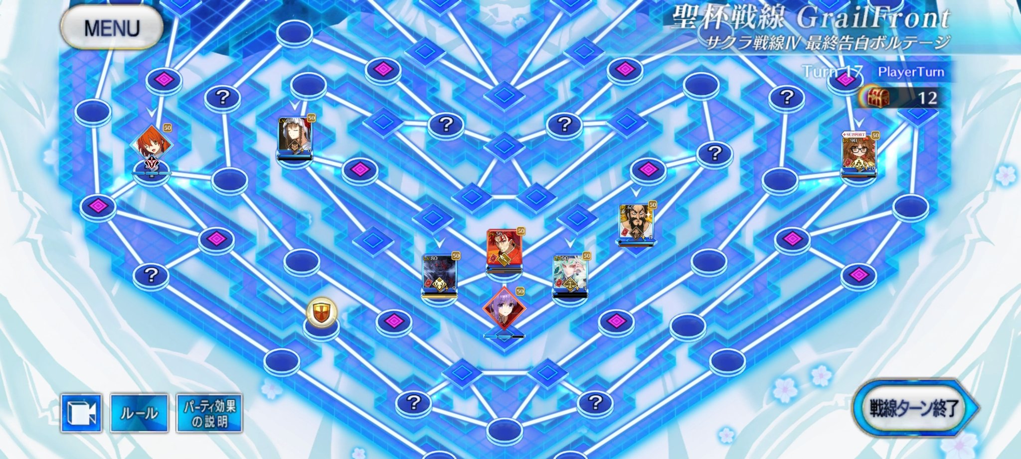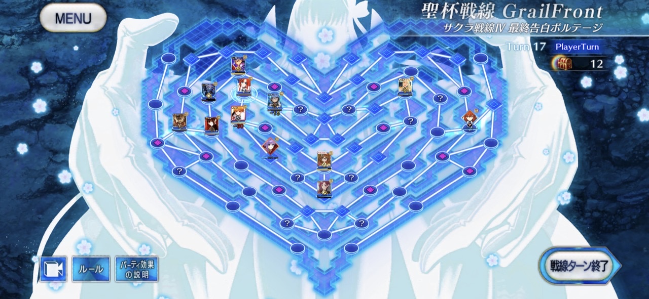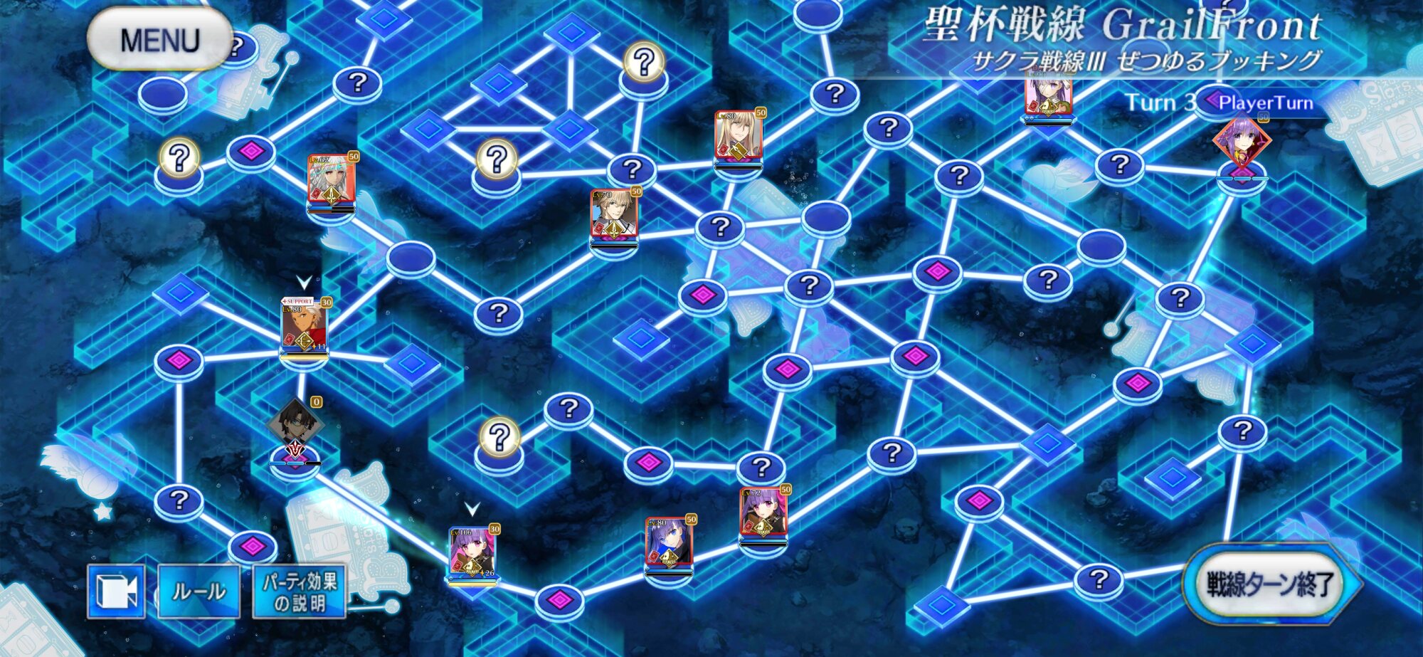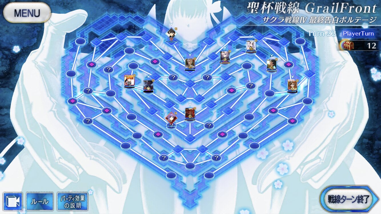 ・中陣は3騎をそれぞれBBスロットマス(?マーク)に一列に並ぶように向かわせる、狂と騎はその周りでPT効果得られるように配置