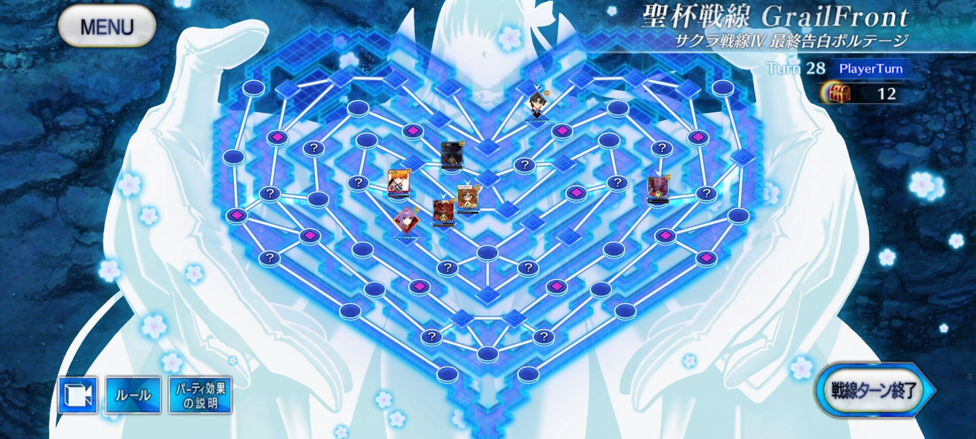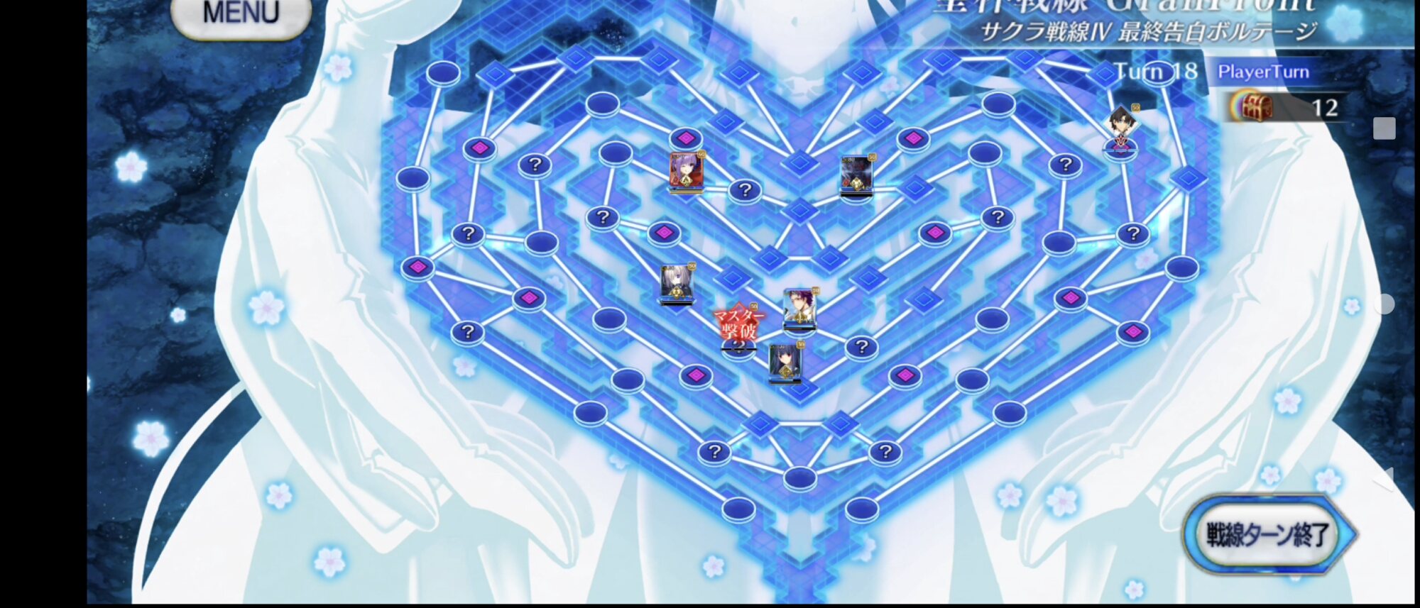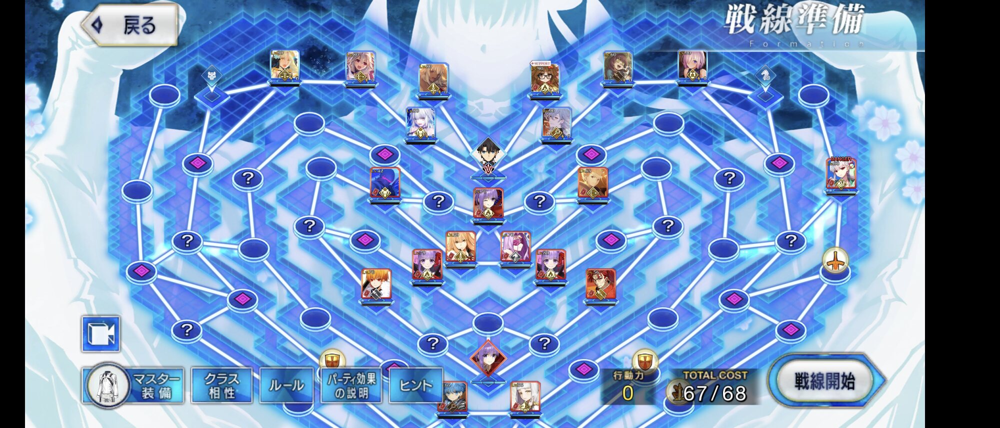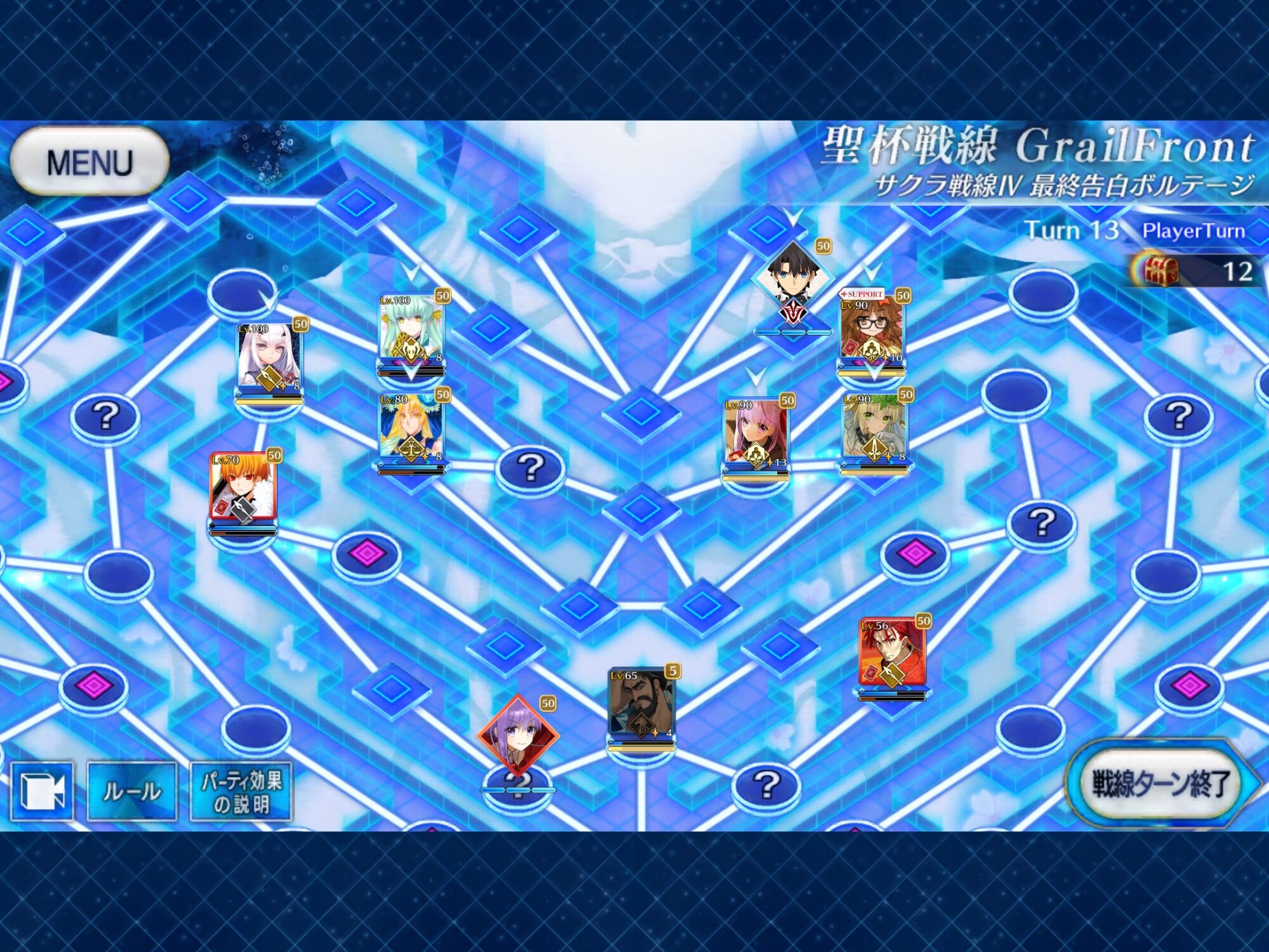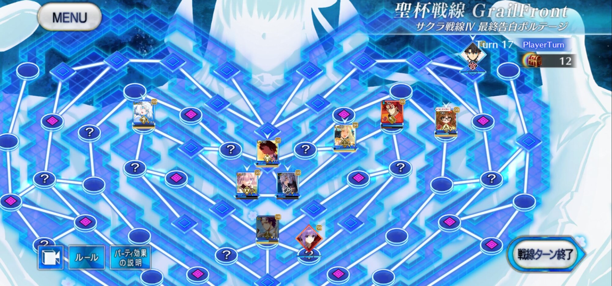 ・中陣は3騎をそれぞれBBスロットマス(?マーク)に一列に並ぶように向かわせる、狂と騎はその周りでPT効果得られるように配置