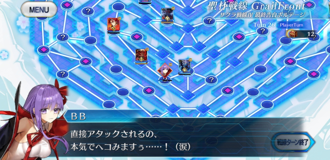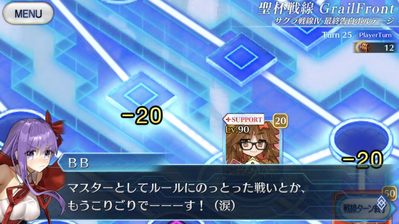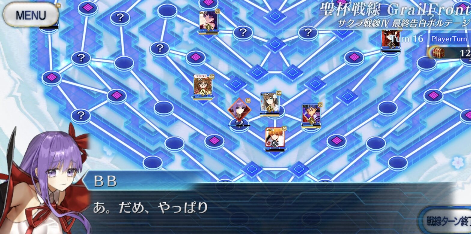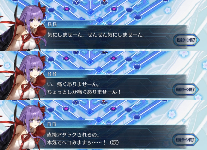 5~6ターン目、中陣に向かってくる敵とリップを排除し終えるとBBちゃんの弱音セリフ