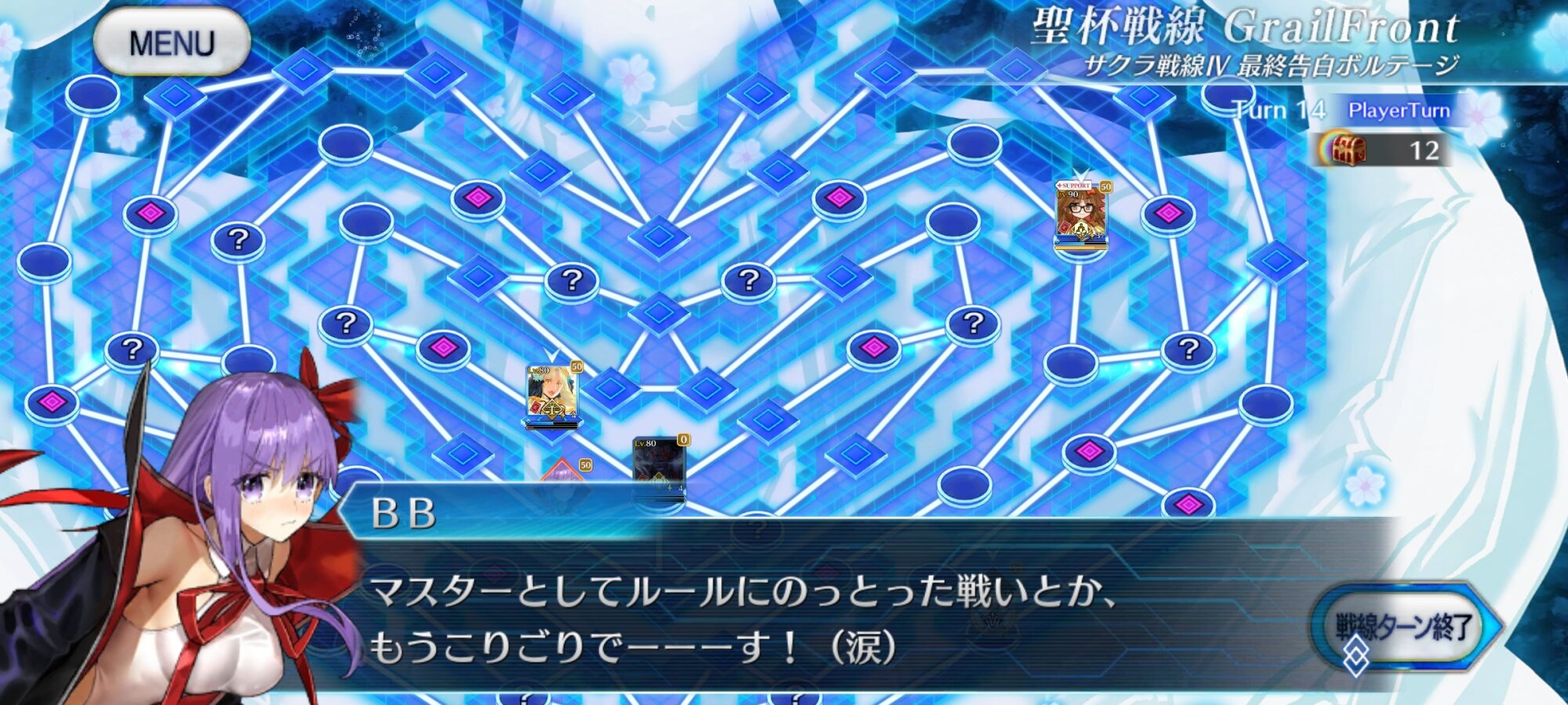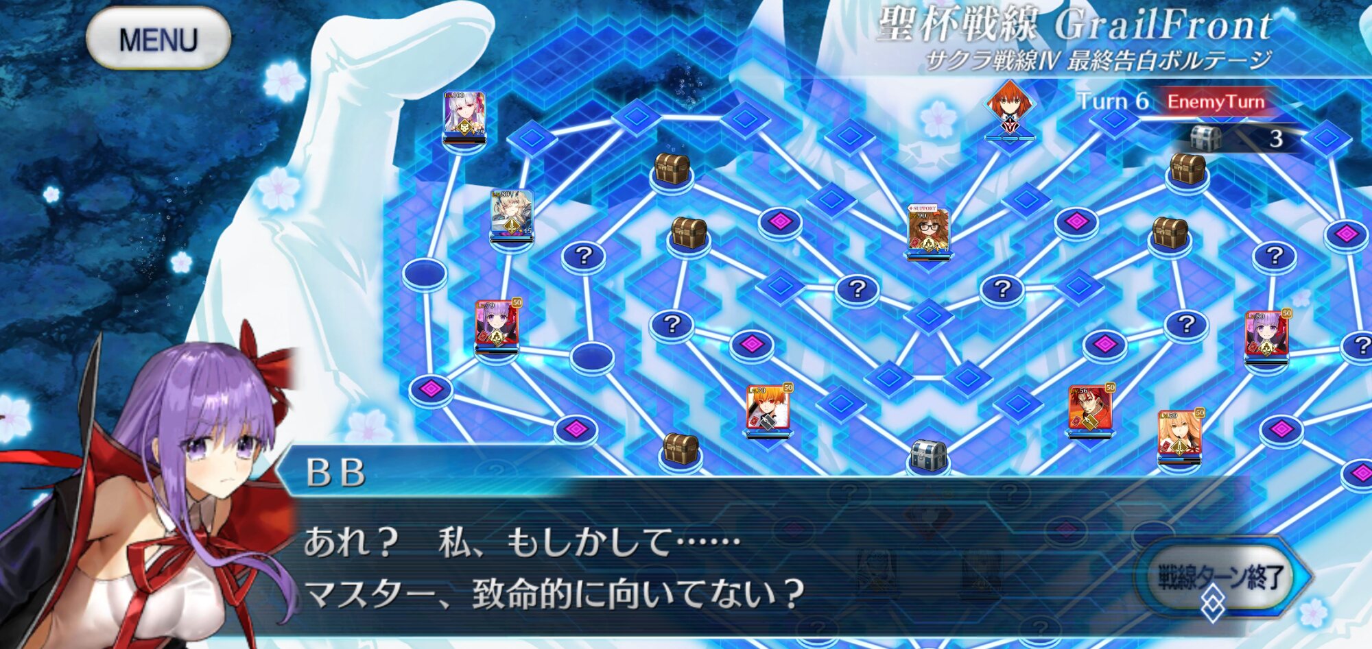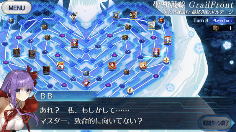 このあとBBちゃんを味方で囲み、メルトからマシュとマスターを十分に離すと追ってこなくなるので、じっくりプロテア撃破と宝箱回収し、スキルゲージの回復した誰かでメルト倒してクリア