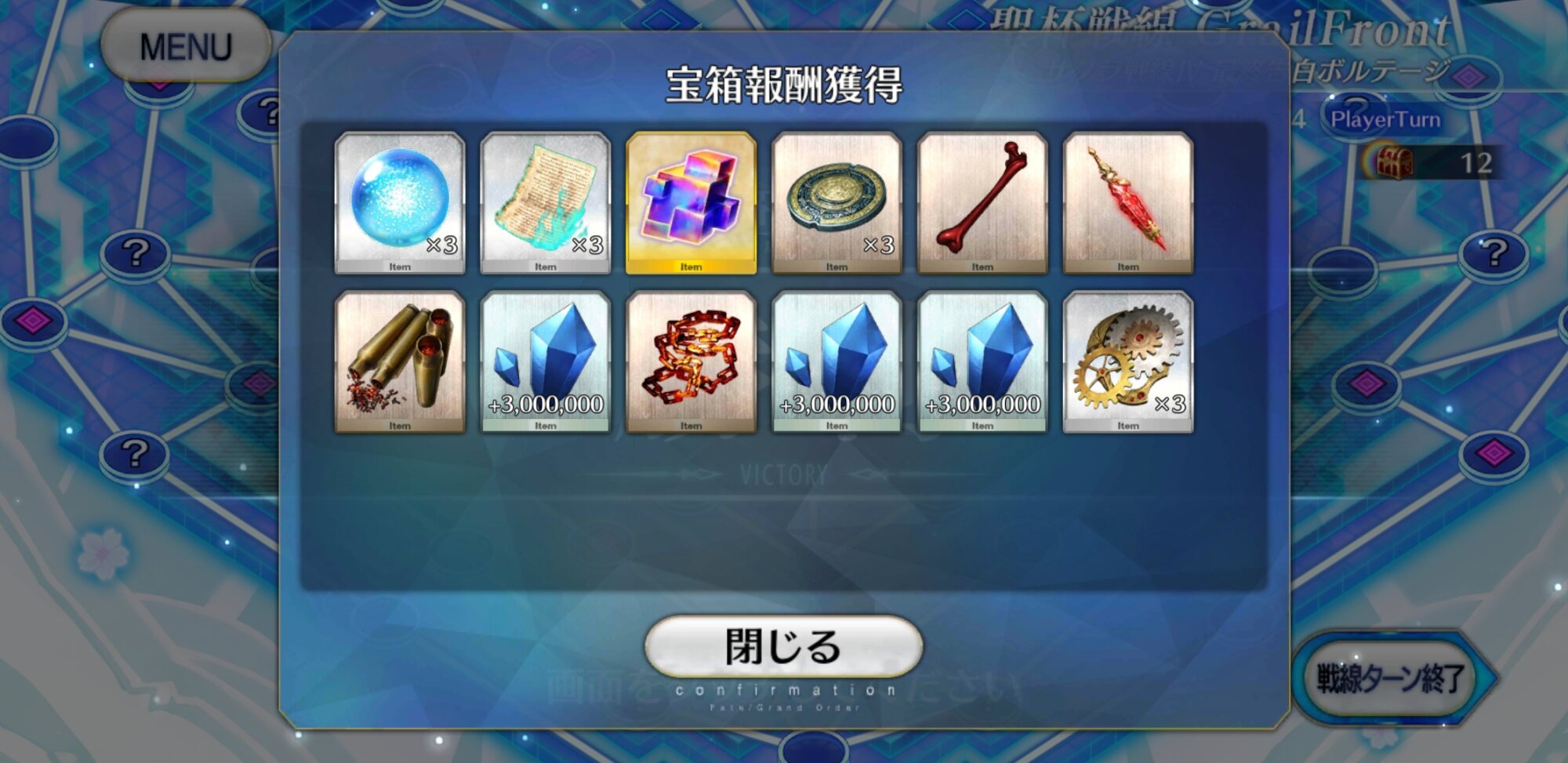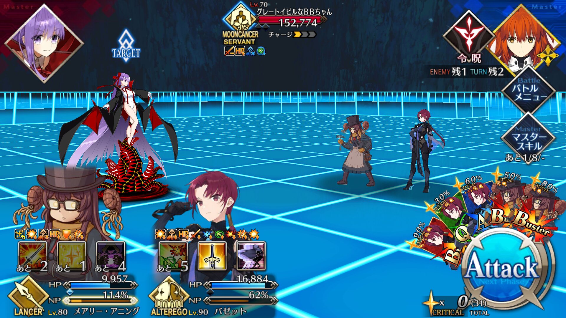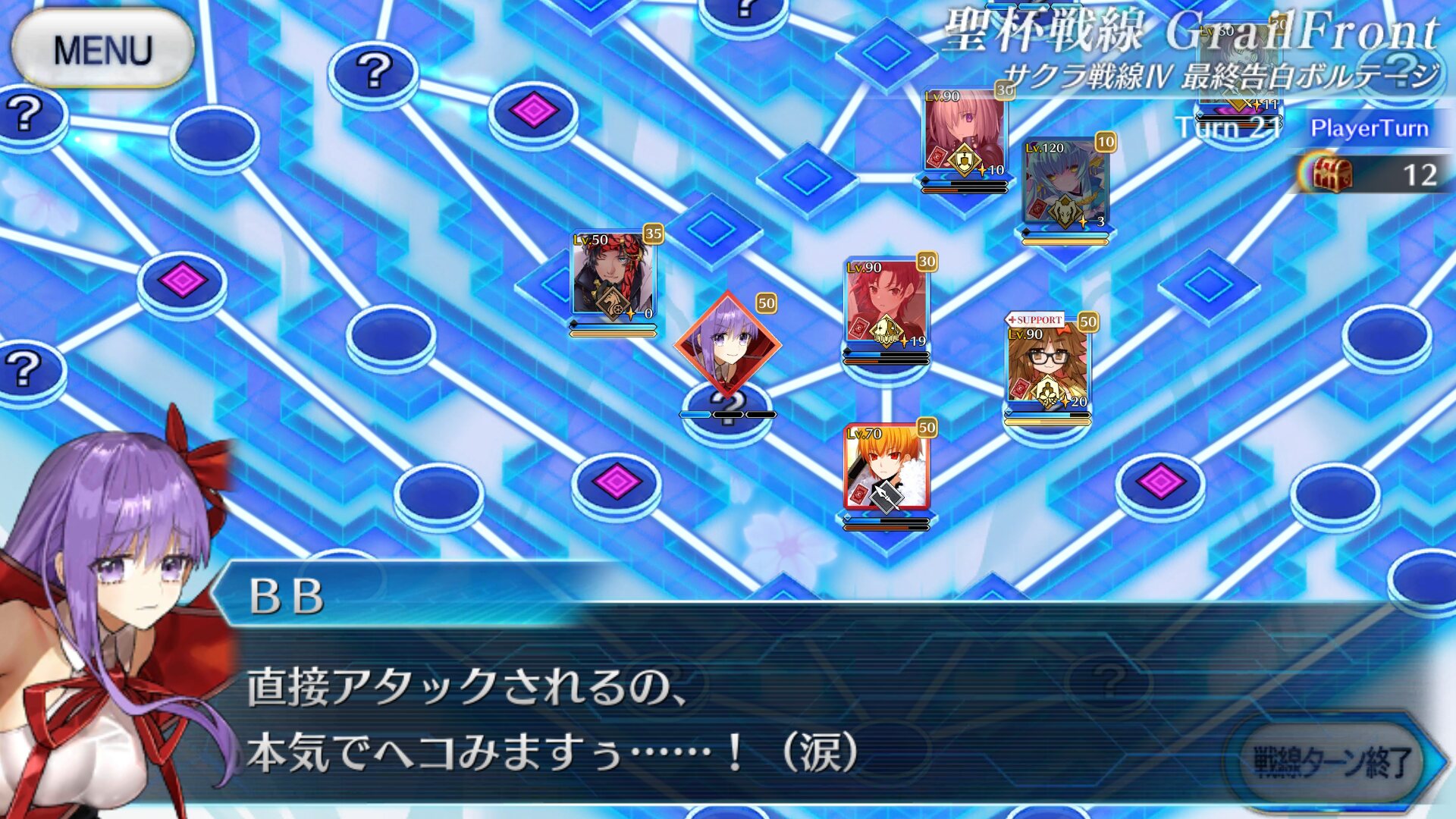 このあとBBちゃんを味方で囲み、メルトからマシュとマスターを十分に離すと追ってこなくなるので、じっくりプロテア撃破と宝箱回収し、スキルゲージの回復した誰かでメルト倒してクリア