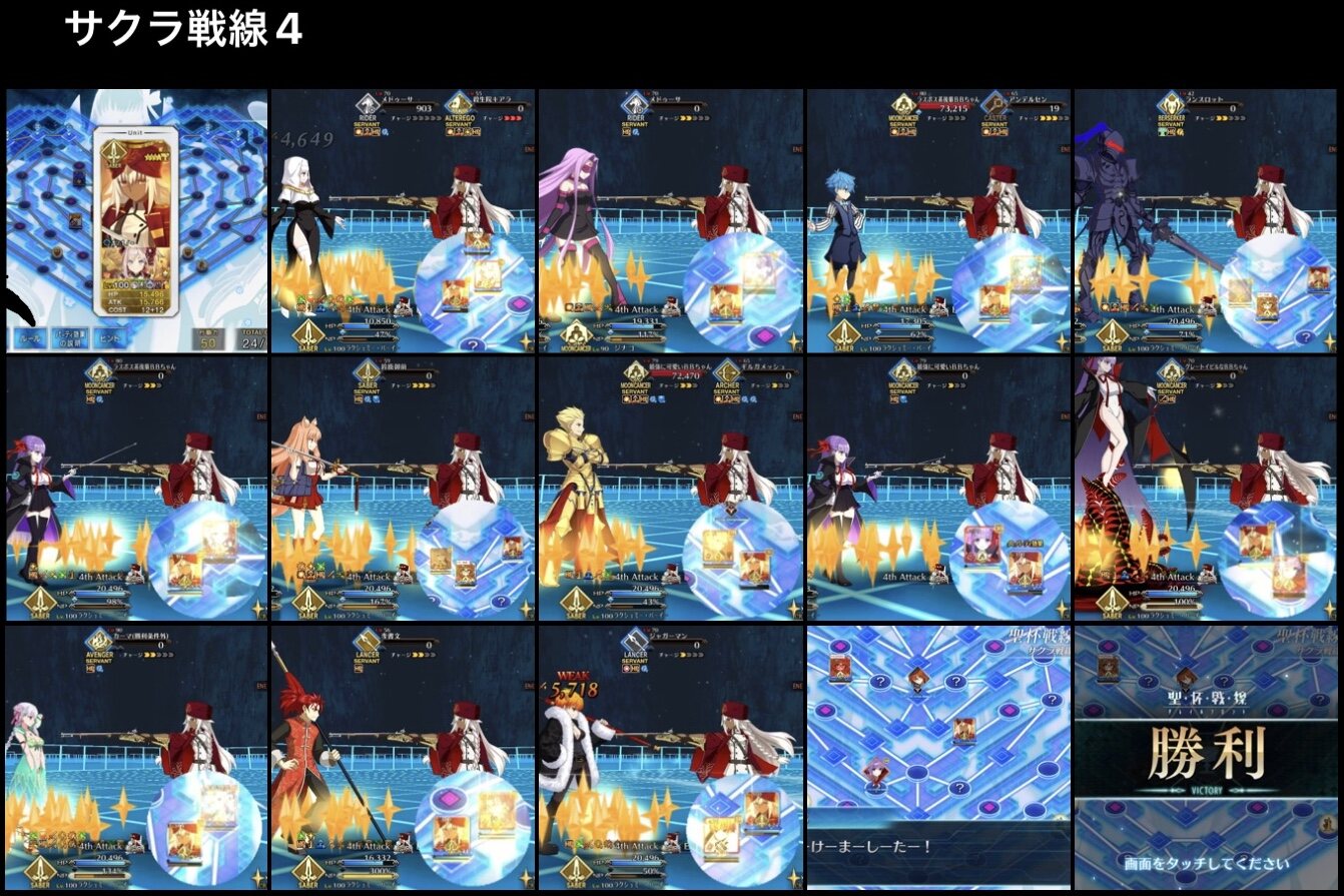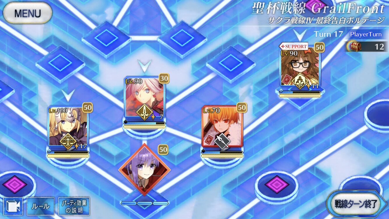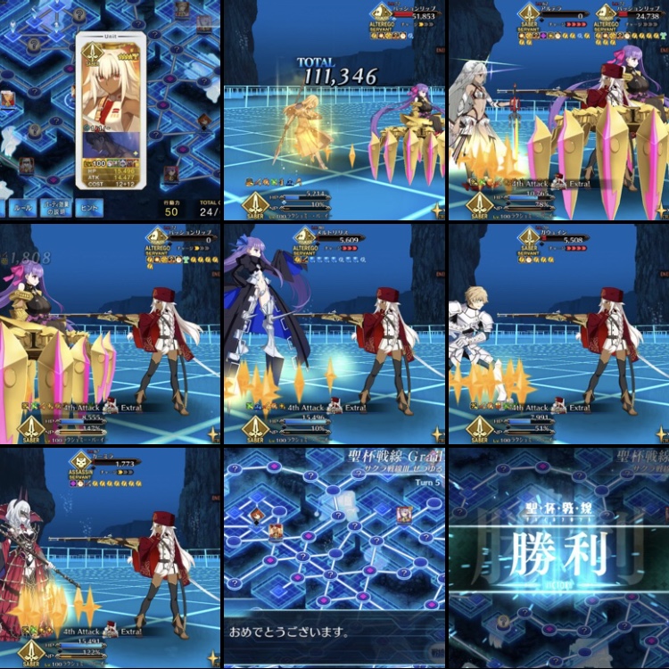 宝箱回収だったんだけど、メルトを倒した後マスター含めてみんなで左上を目指せば2マス離れた時点でリップがサボるの、初回で発見できてたらなあ…セイバーが早々に落とされるミスをしてしまったが、槍ニキとオルタニキがガヴェイン、メルト、リップ、プロテア撃破してポカを帳消しにしてくれた