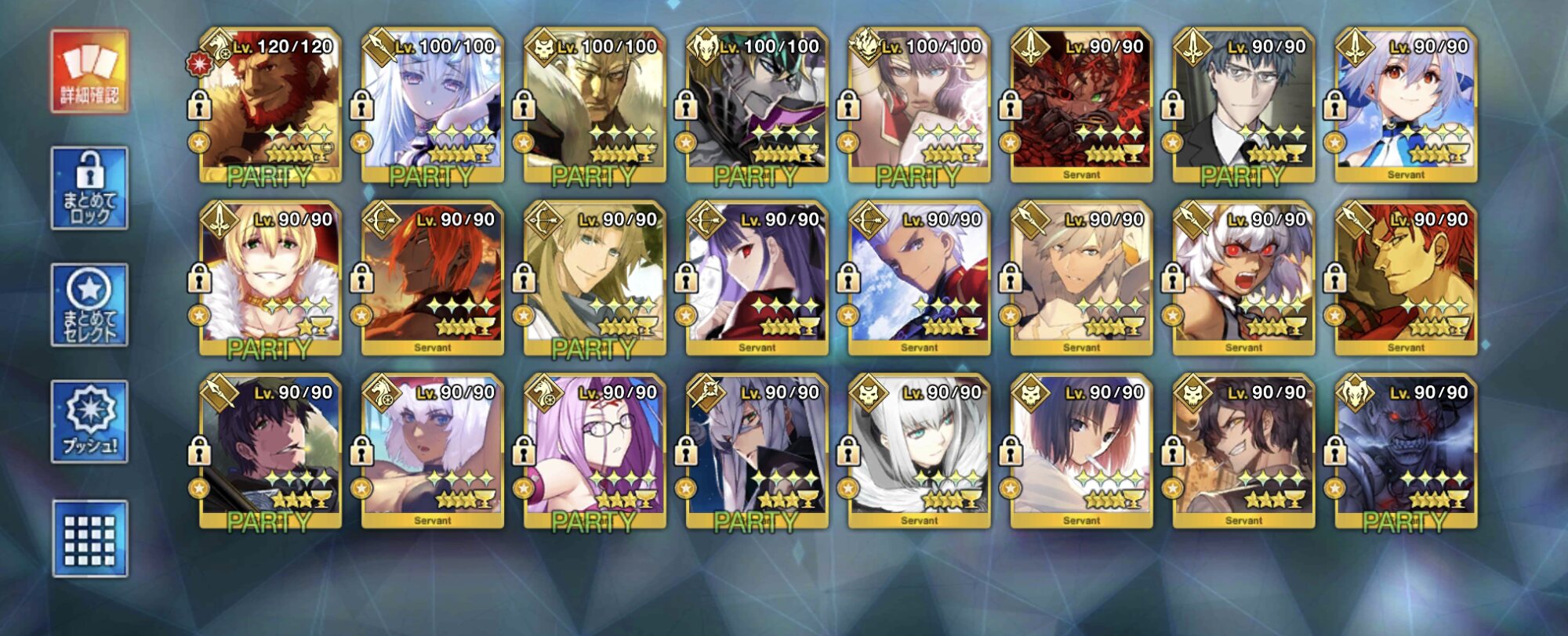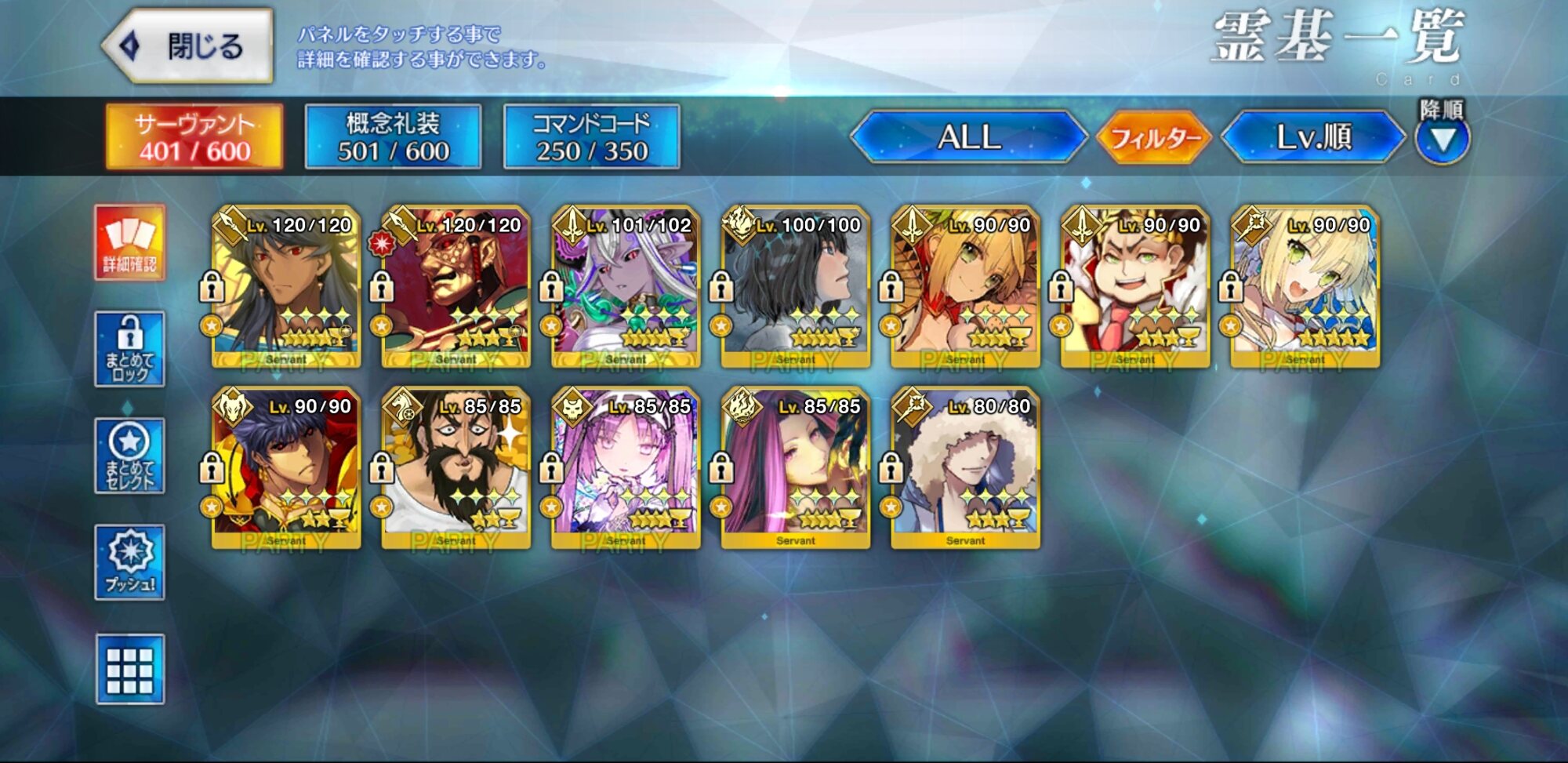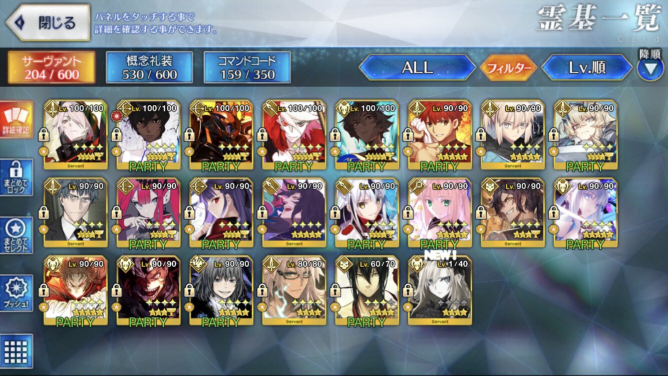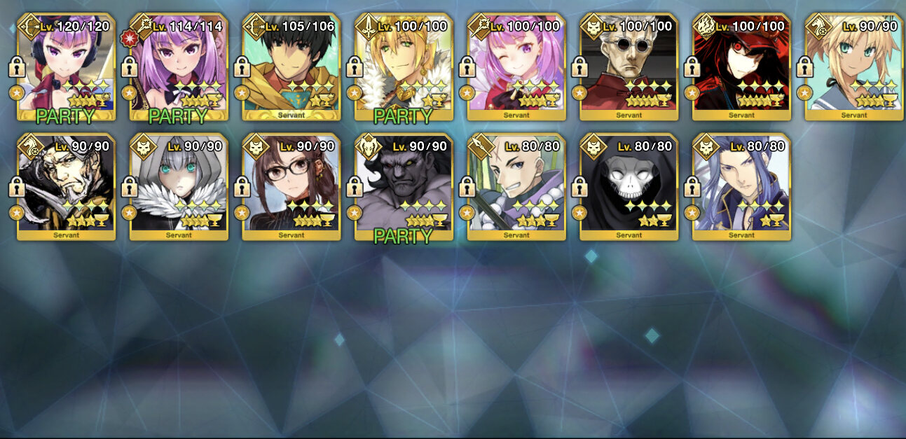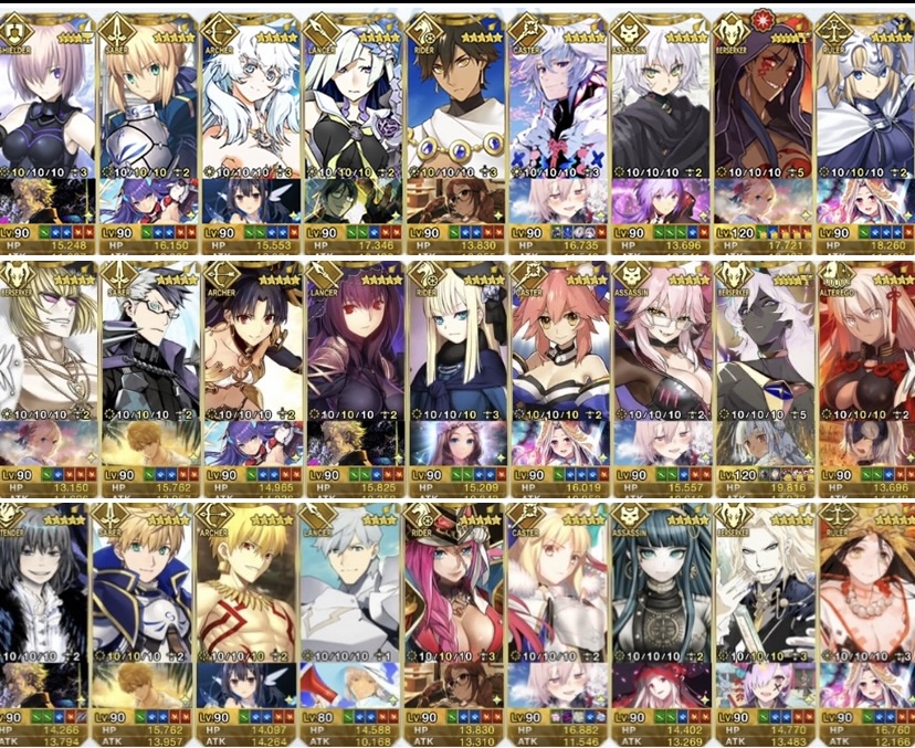 120はアタランテが最初なのでアタランテの宝具レベルが4より上にいかない限り誰もそれ以上に行けないんだ。ウチの聖杯組(予定含む)はこんな感じですね