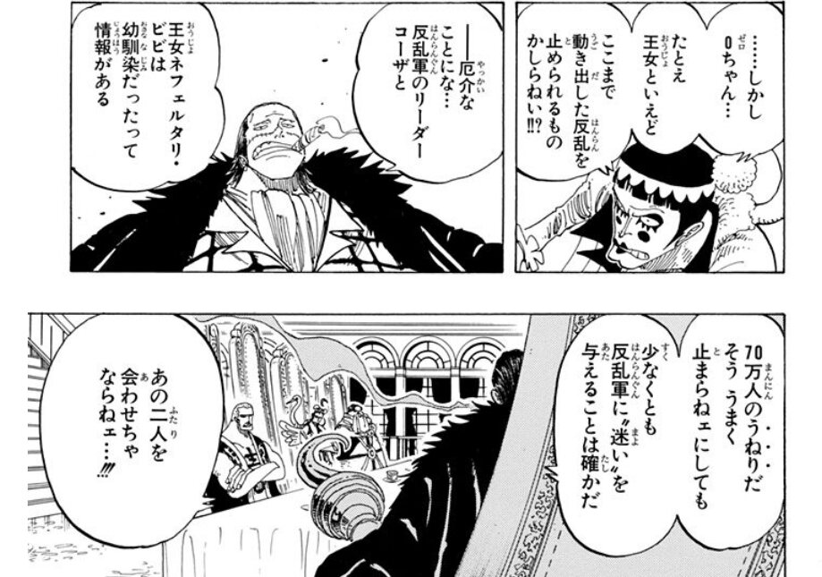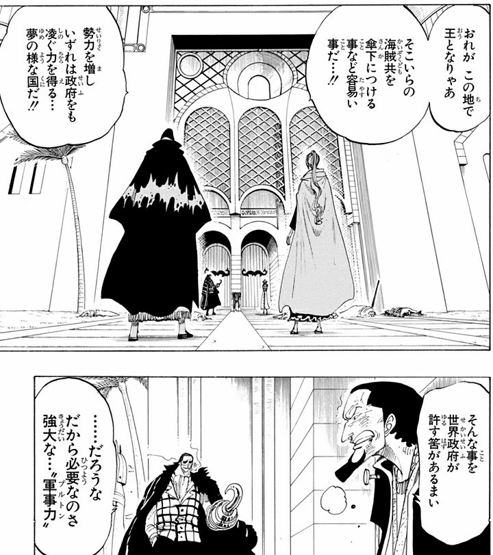 ただまぁ、治安維持の名目でアラバスタ乗っ取りはそのまま出来そうだったし(ドフラみたいな感じで)、政府に楯突かなきゃまだプルトンも要らないので