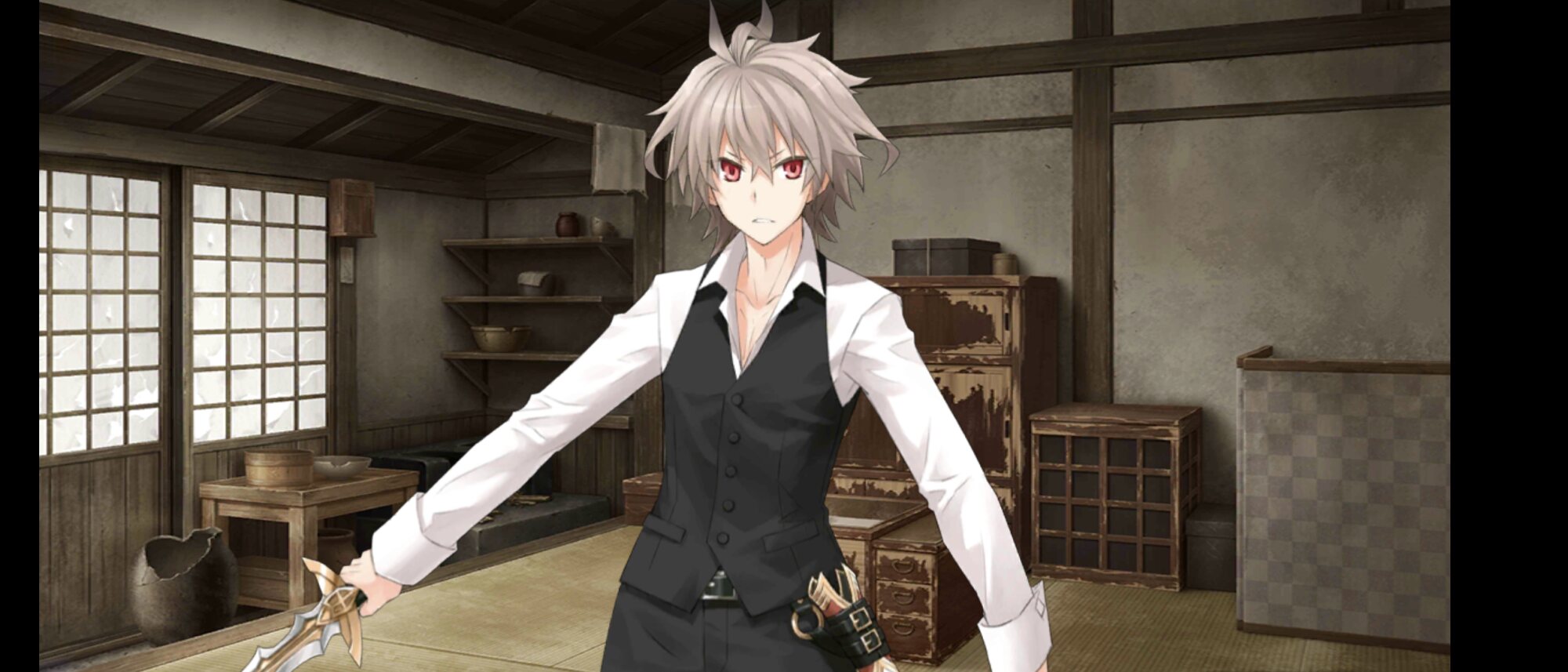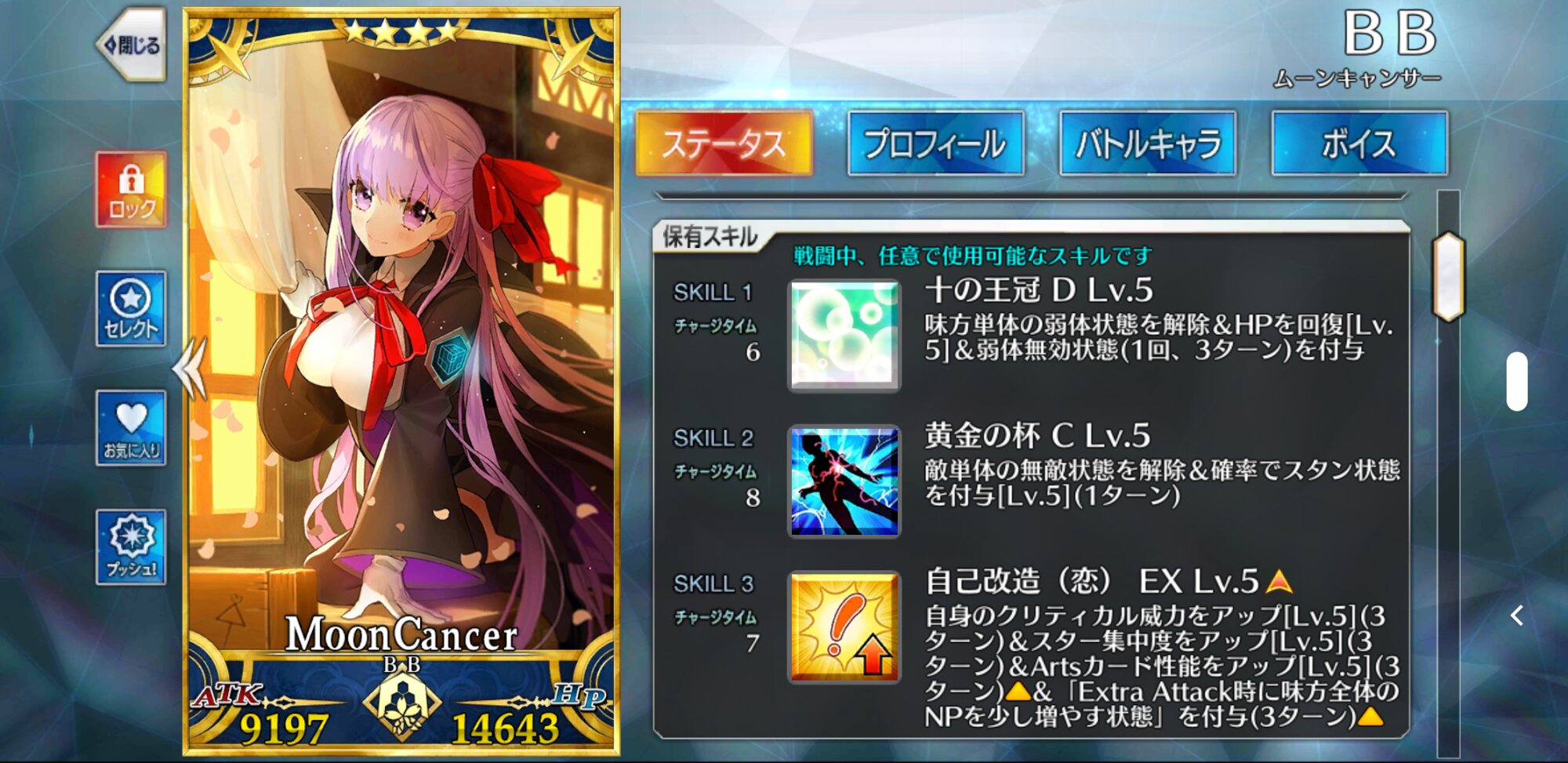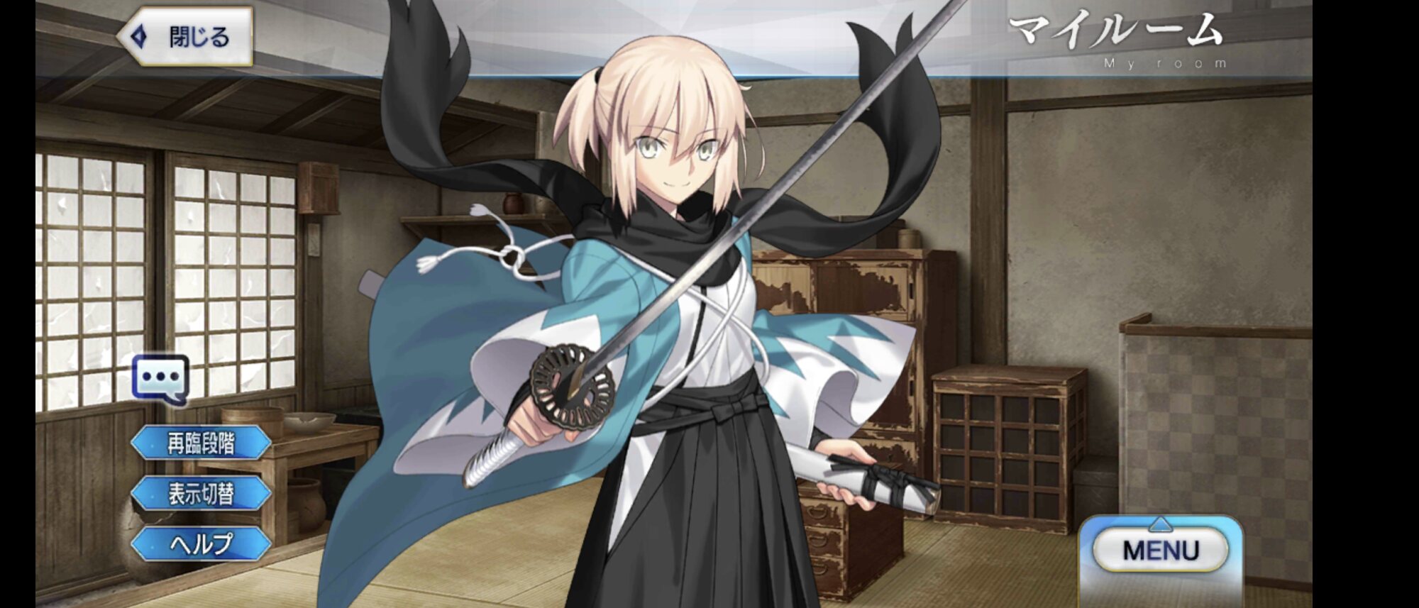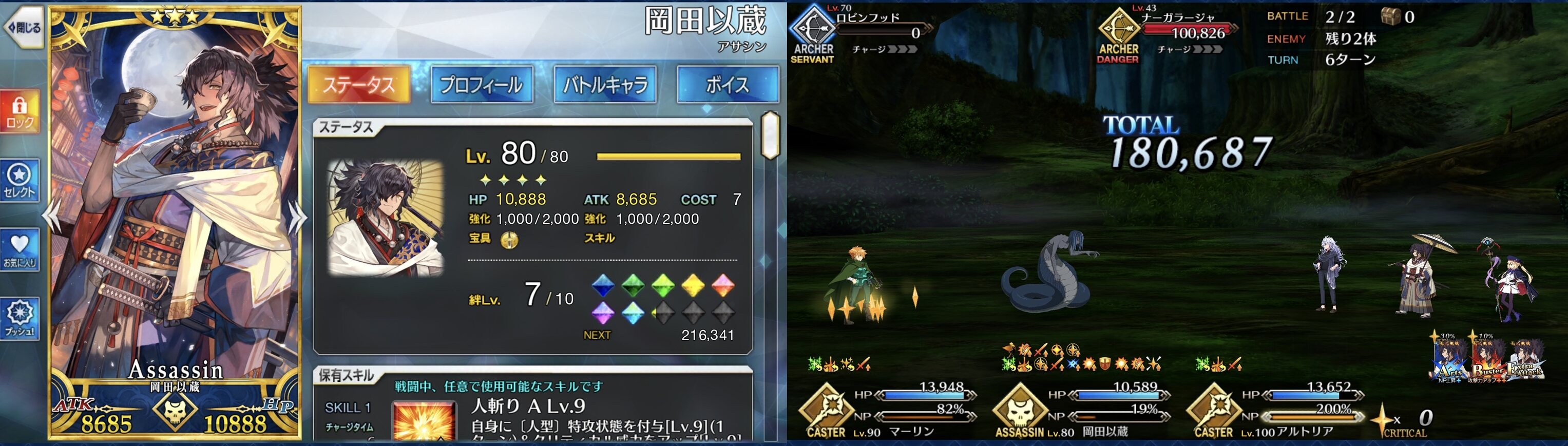 スキルは高倍率の人型特攻とクリティカル威力アップを1T付与する「人斬り A」、回避1Tと3T継続するクリティカル威力アップを付与する「心眼(偽) C」、スキルレベル1で300%のスター集中を1T付与する「撃剣矯捷なること隼の如し A」の3つ。宝具は攻撃前自身のスター発生率大アップ(3T)を付与しつつ、4ヒットするA単体宝具『始末剣』。強化クエストをクリアすることで宝具が強化されて、OCで特攻威力の上がる「人の力を持つ敵」特攻宝具になったほか、基礎威力が向上する。
