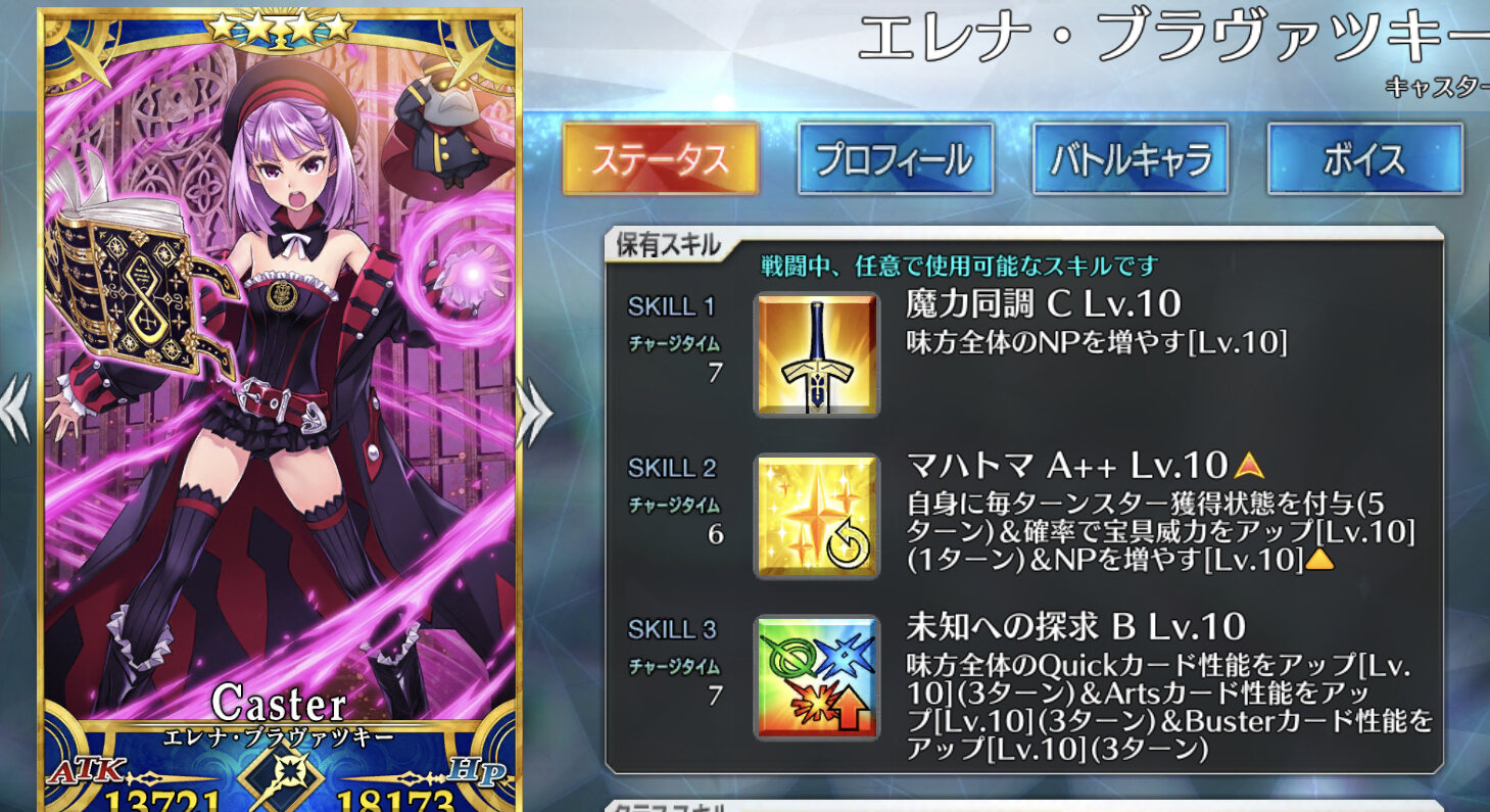 クリアップ、自己NPチャージ、毎ターンNPと星を配る3つのスキル。そして回復目的だとかなり強いスキルを持つ耐久向けサポーターです