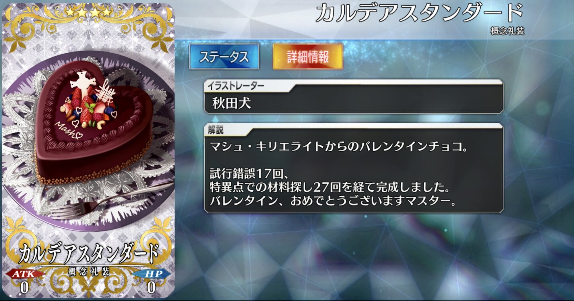 血の汚れは乾くと落ちにくいからね~>マシュの手作りチョコ「カルデアスタンダード」は試行錯誤は17回、特異点での材料探しは27回を経て完成した。
