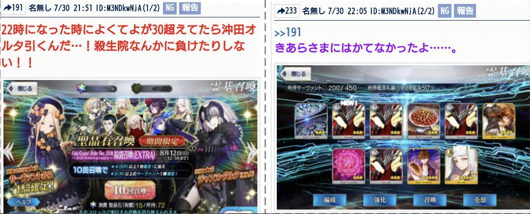 R18関連話題、よくてよ無しのガチャ結果、実装から二週間以内のシナリオ及び開催期間中のイベント内容、進行度依存の報酬、最終再臨や霊衣解放の画像や話題は専用スレにてお願いします。