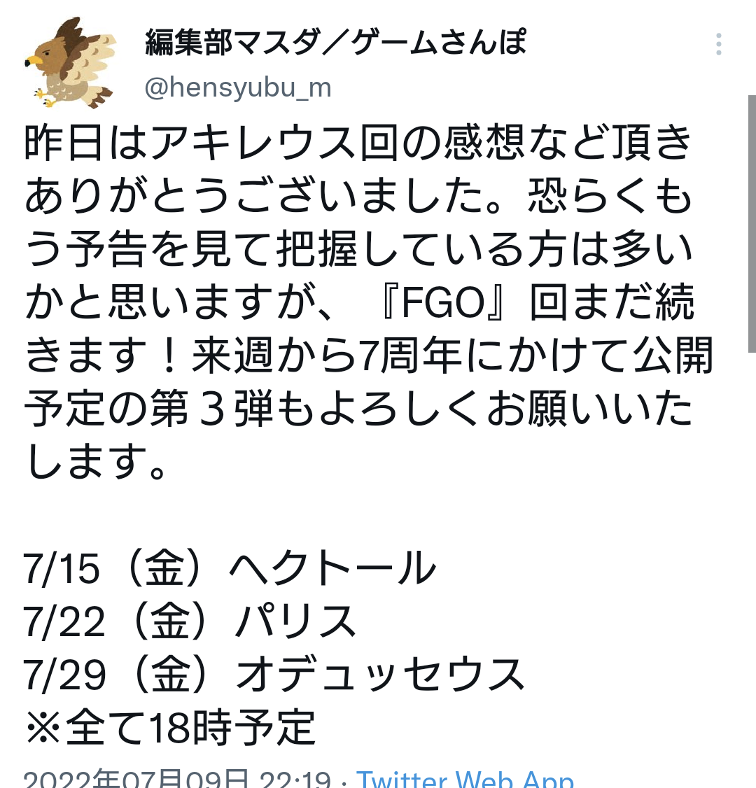 予想を挙げるのであれば、これまでのインタビューで語られてた水着鯖の選出基準からブラダマンテ辺りが来るんじゃないかなと思ってる