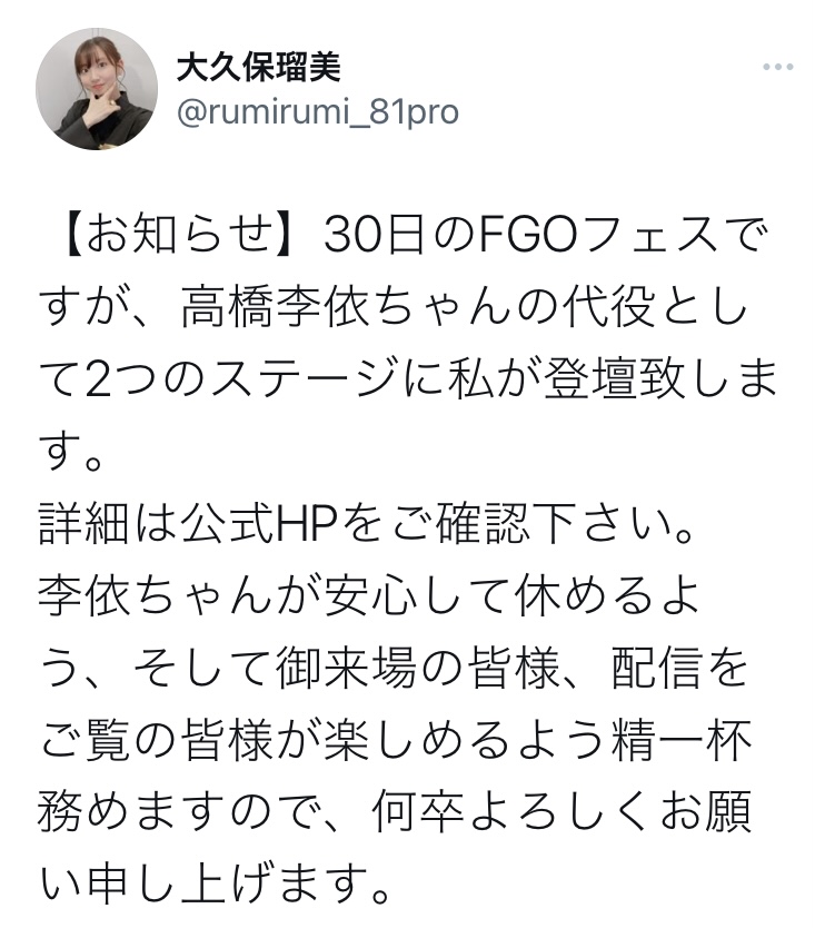 毛も剛なんですかね?31日はりえりーとるみるみ両方登壇予定のステージの『FGOプレイヤーの集い ~バラエティトーク~』と出演者の一人としてりえりーがいた『カルデア放送局 7周年SP』があったのだけど、それはどうなるんだろ